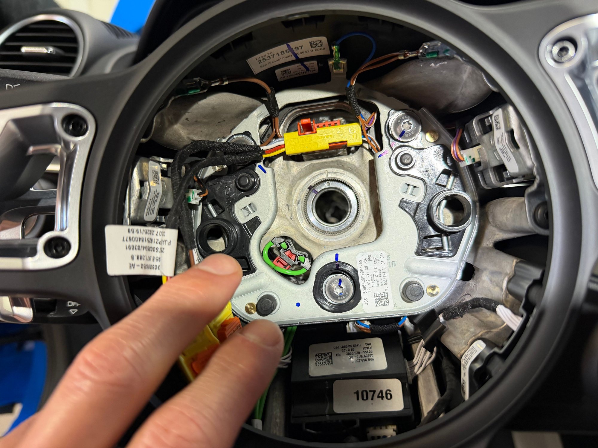 4. Pull the airbag out and disconnect the 2 connectors using the small screwdriver. Pay attention to where the airbag wires are routed so for install you can put them back in the same place.