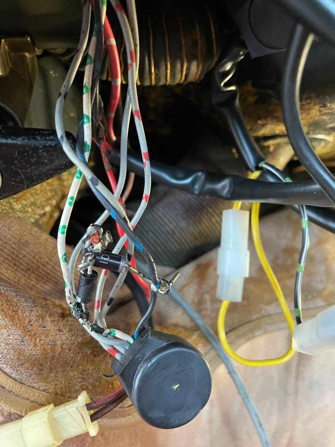 Well, making progress. Managed to find all the relays and jumps. That said the ignition loom was not plugged in? Presumably b/c of the jump on the relay. Got it all wired up and ready to plug into the closest plug in the fire wall. However, what in the world is this rigged diode thing and considering it is not even plugged into a slot on the fire wall, what on earth could it have been attache to? Better yet, looking for where it plugs in?