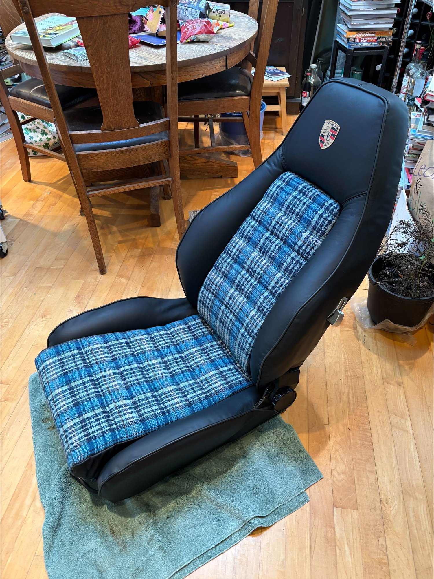 They're black leather with Blue Karo Madras tartan inserts, plus the stainless latch replacements from Only944. Numerous other upgrades in sight, starting with a new factory dash from Porsche. Rennline fire bottle holder. Momo Prototypo steering wheel. Stainless "Turbo" shifter insert from Rennbay and hand brake button on the late 944 park brake handle, also Only944. Do still need to make a proper boost **** mount and reinstall the AC modesty panel, which will let me tuck in all those extra wires from the Microsquirt conversion.