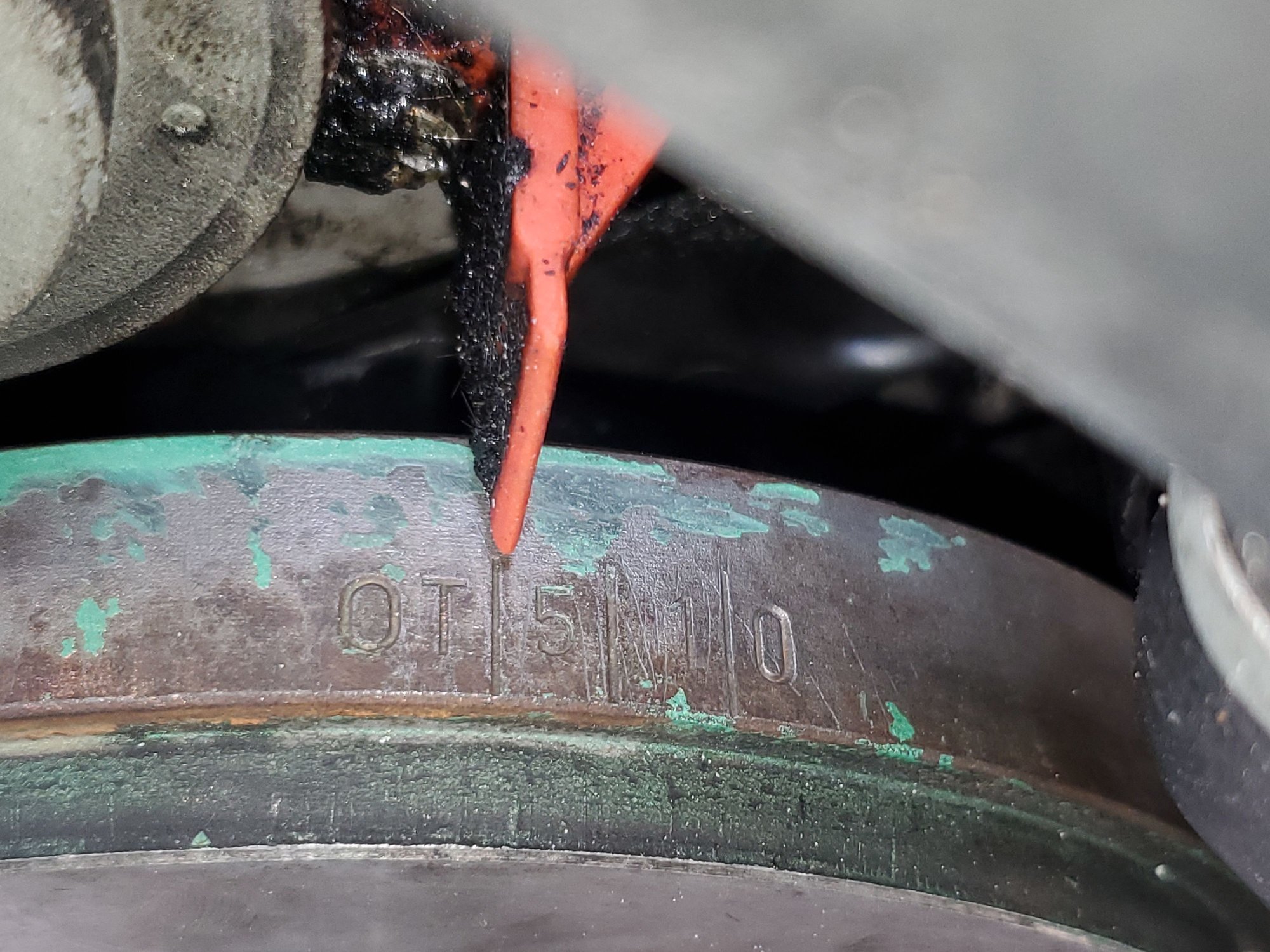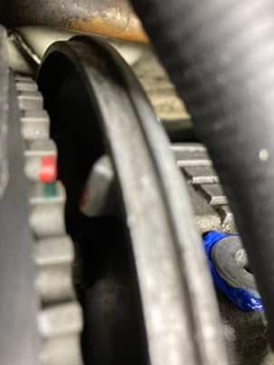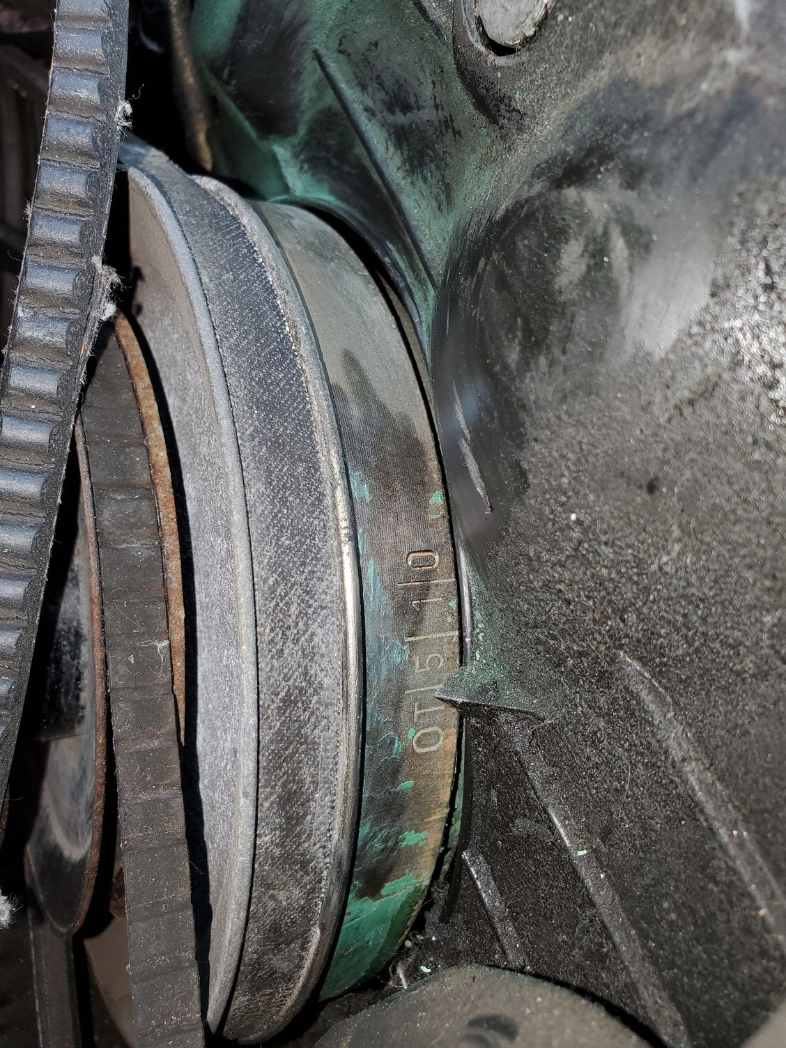 The cam timing looks good now that the harmonic balancer is installed correctly. The balancer and pulleys are marked from 928 Intl. I know this car was hit in the front at some point. I'm guessing the balancer and pulleys were replaced as part of the repairs for that and the timing belt was left alone.