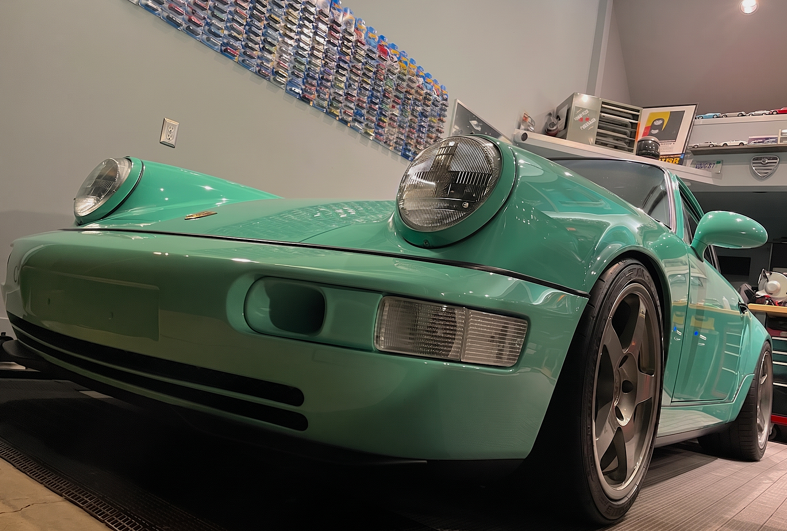 Great looking mint green car. And I love the Rennsport poster in back.