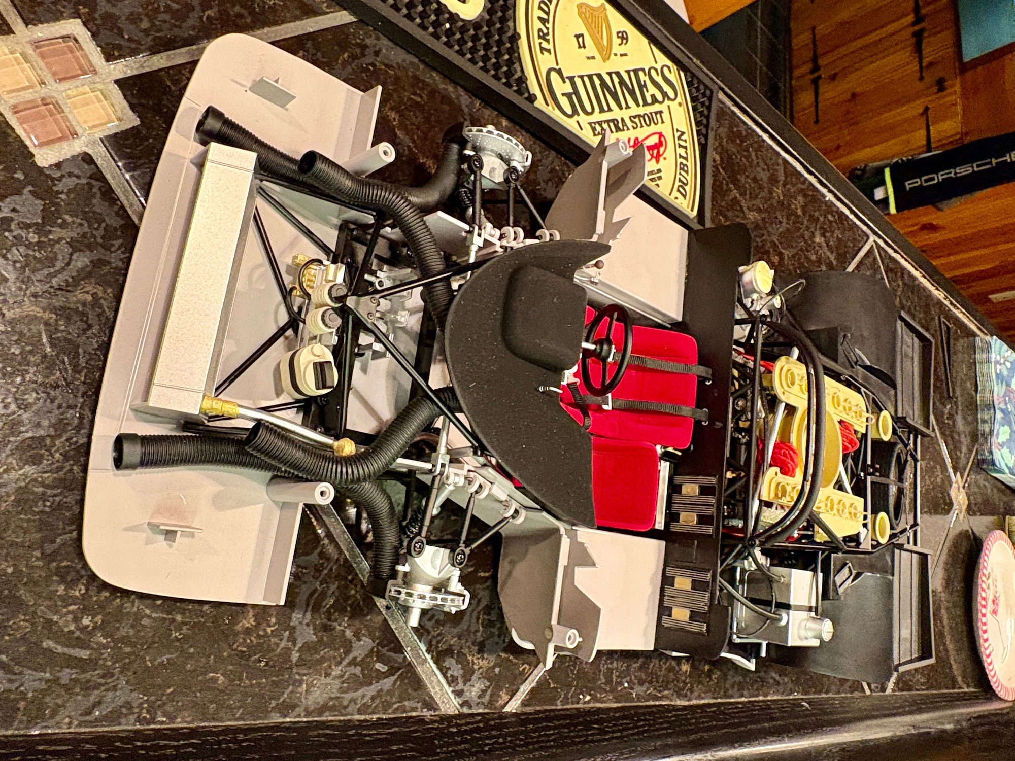 This is by Pocher. They build 1/8 car models. This is mostly metal and weighs about 8-9 pounds when done. Their kits got me interested in cars way back when I was 13. I built 2 of their Alfa a RR & Fiat models. They are very nice kits with the worst instructions. It is easier to build a 964 than this kit but having fun adding all the details. It is hard to see since the work has been done but the time I spent painting all the fittings and making the seat belts etc is considerable. I need to up my patience even more then when working on actual cars. My inability to see up close doesn't help. The earlier kits had you build the engines but this kit is just show only, the body and steering work.