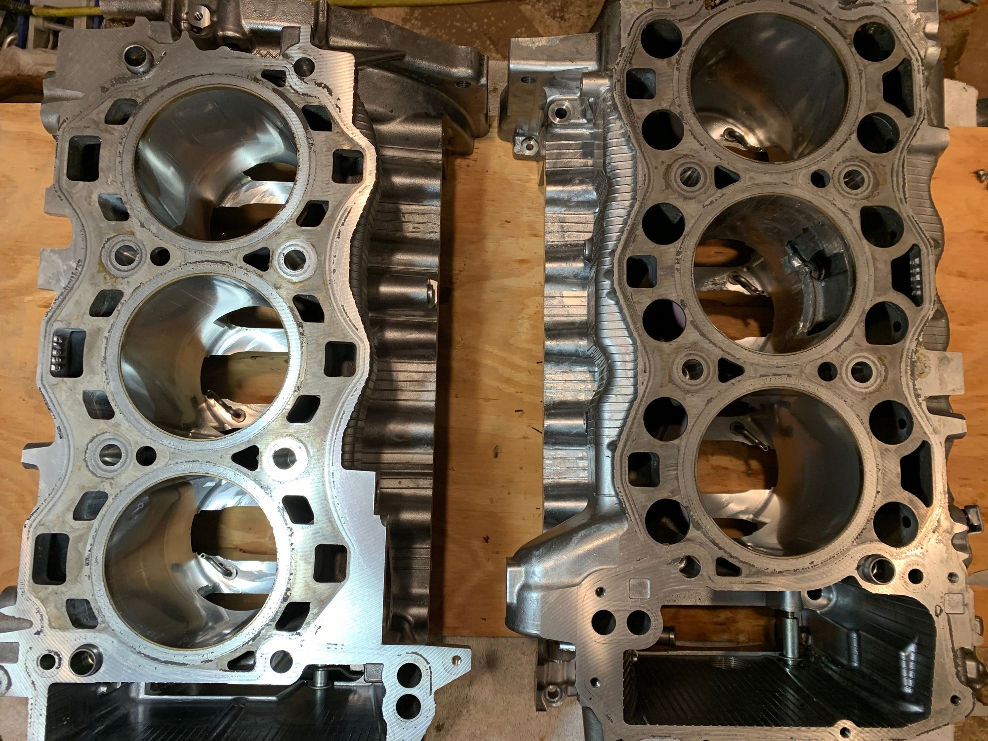 This replacement engine is also out of an '09 Cayman S, and I got it for very little money, but don't know how many miles are on it or anything else about the car it came out of. I finished tearing it down last night, and will post more pictures over the next couple of days. The #2 cylinder is destroyed, but that's fine since I'm going significantly oversize with new wet sleeves anyway. There is some wear on the bearings, but nothing concerning, the crank looks fine, etc., though I haven't measured anything yet. I may need one cylinder head where a couple of valve heads broke off and got beat around.