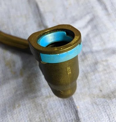 This step is tricky due to limited space. Two SAE EFI Quick Connects attach to the canister: one has a two-sided release mechanism, while the other has a single-sided release.