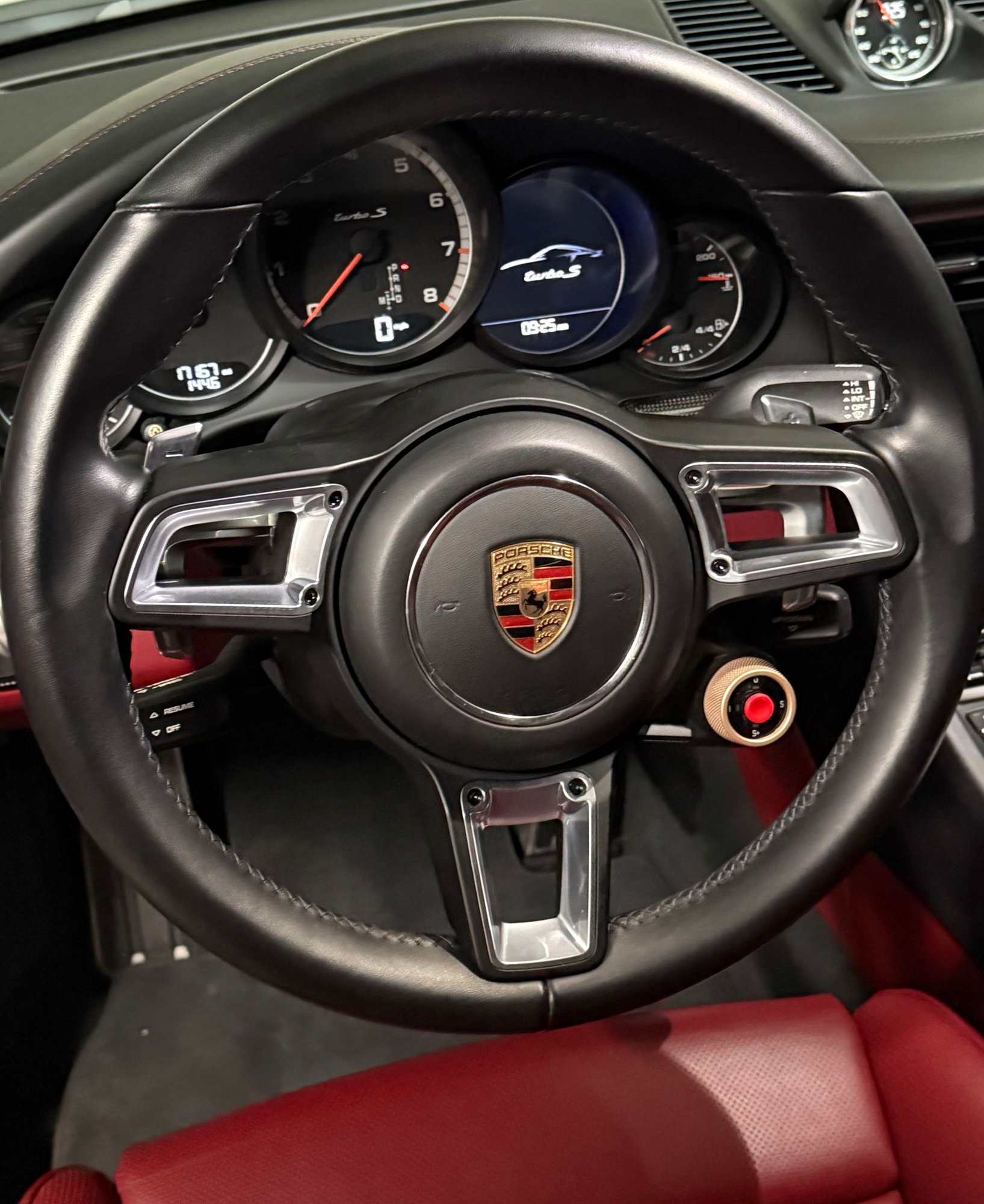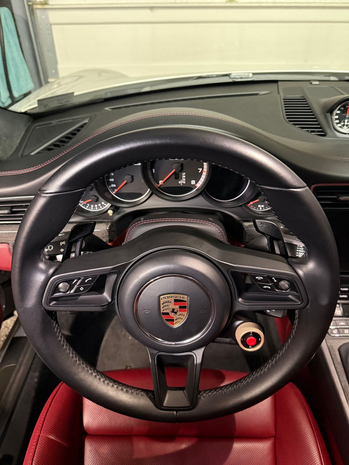 After same GT sport 360mm wheel. Autotecknic Black RS paddles. OEM black leather with Bordeaux stitched steering column casing. OEM black multi function buttons with black trim.
