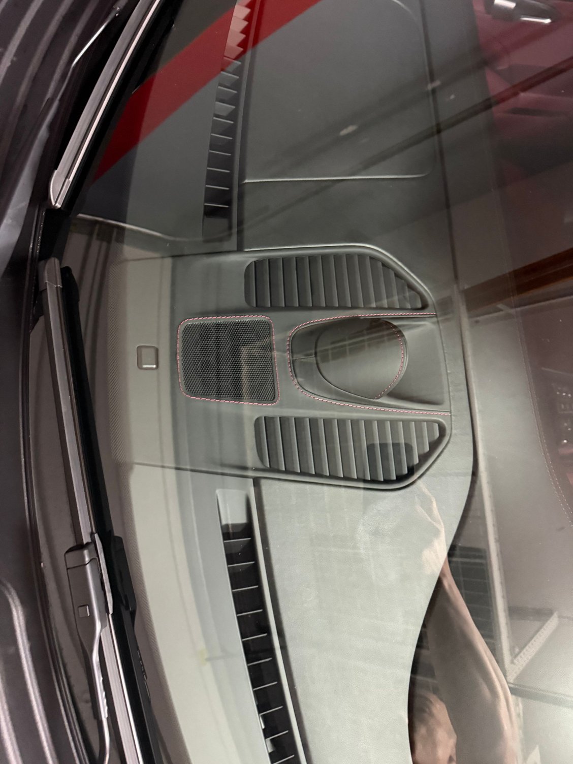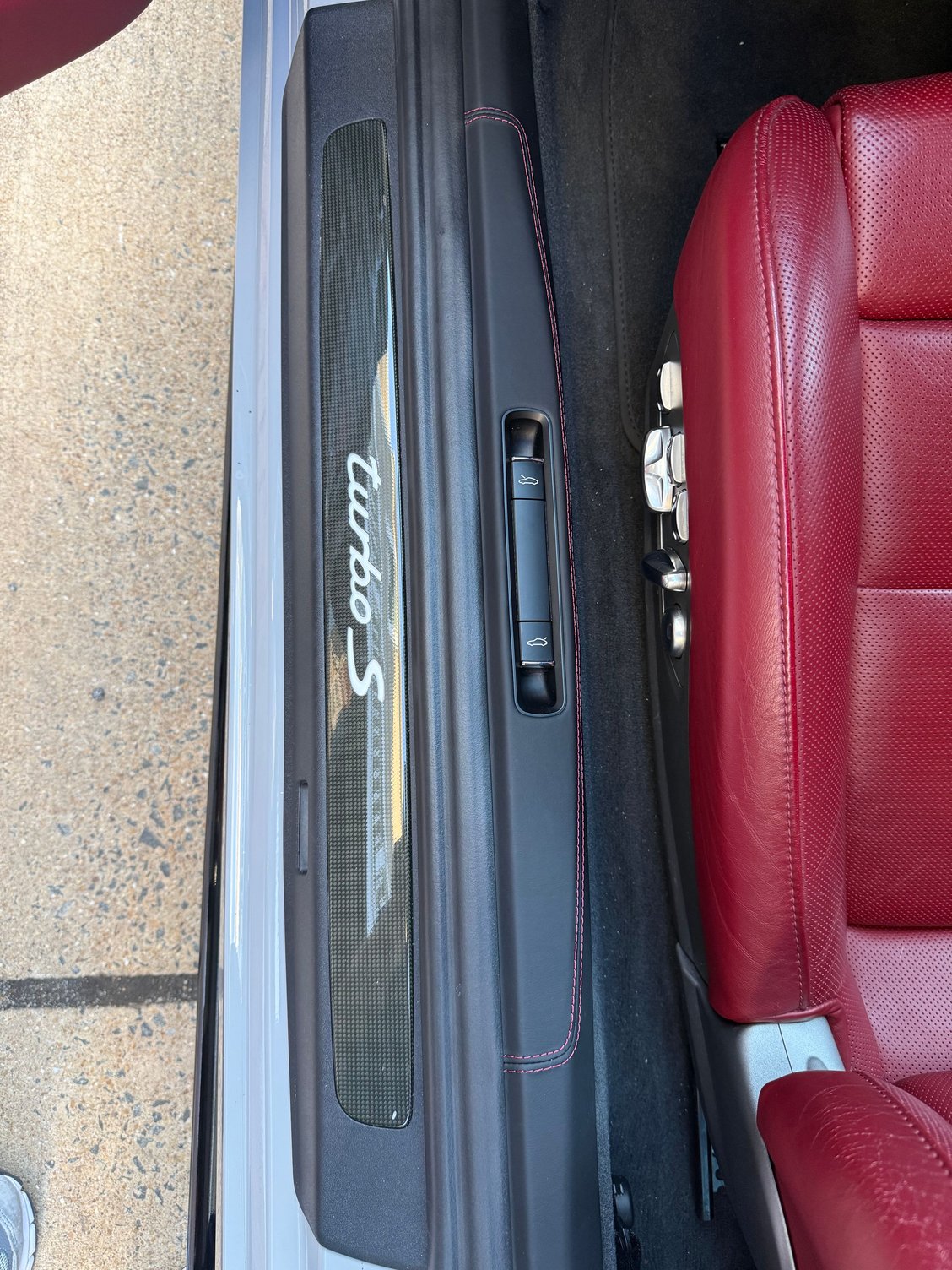 More leather parts. Inner door sills. Black Napa leather with deviated Bordeaux stitching. Have OEM Alcantara sun visors without the stupid airbag stickers on the way.