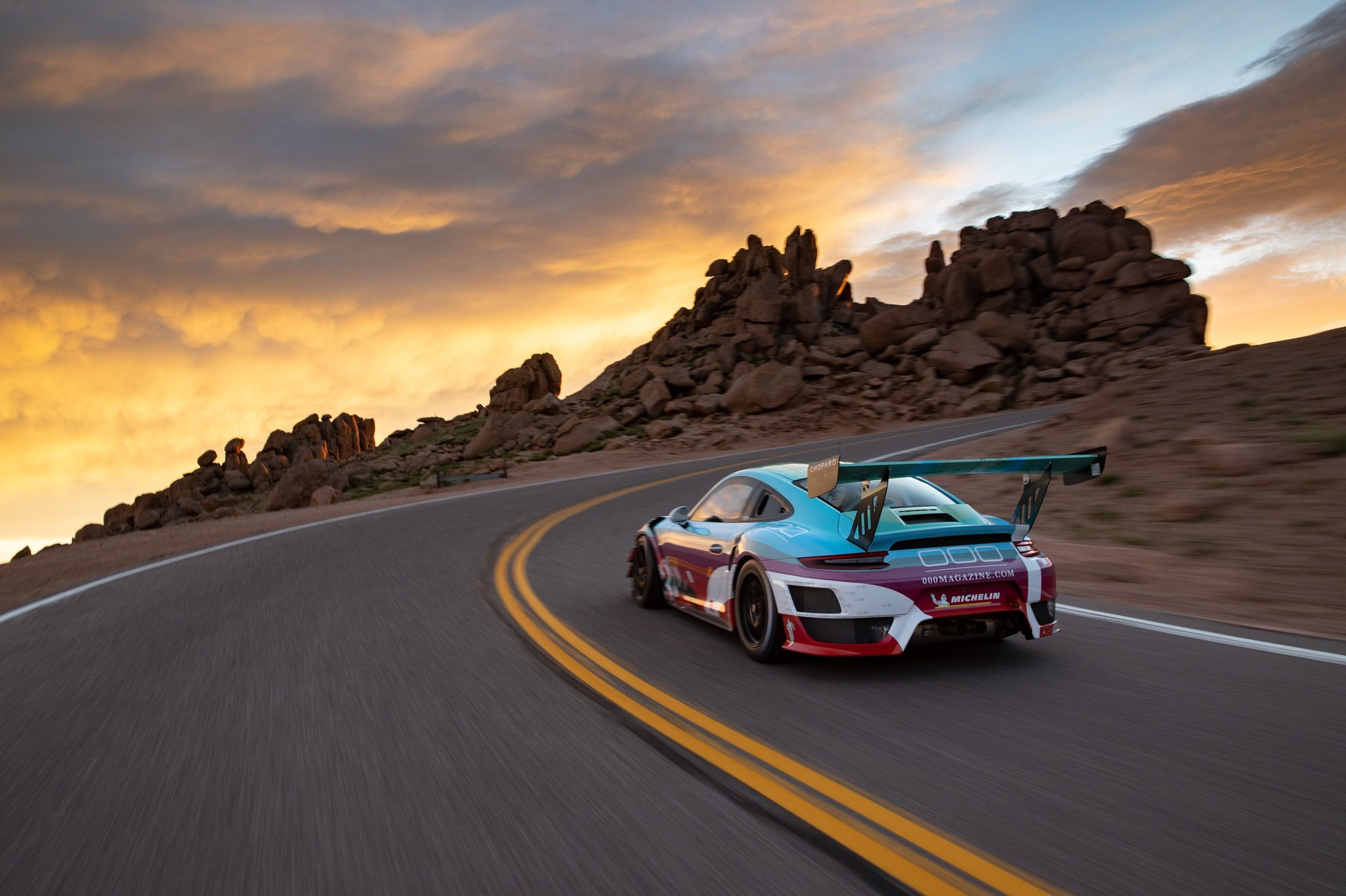 The 991 GT2 RS Clubsport art car was designed by Justin Page, who did concert posters for Bill Graham Presents (if you know, you know) and far, far more. Consider it 000's nod to the end of the 991 era, and a creative project that wouldn't have been possible if a few sponsors didn't sign on to help us do an art project in a year that sure could use one. They are: Michelin, Chopard, Polyphony, Champion, and Meguiar's. (Mainly, we just wanted to see the GT2 RS/CS in a cool livery and maybe just maybe drive one on Pikes Peak as part of a storyline—because who doesn't want to drive a 991 on Pikes Peak without the usual speed limit? Somehow, they agreed to help us make it happen.)