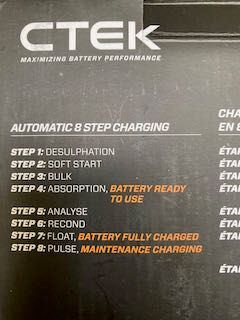 After connecting the CTEK, it ran on a slow charge state (0.6A) in step 2 until the battery reached 12.6V when it shifted into bulk step 3. As for the other times I charged this way, the CTEK will charge all the way to step 7 and float (green) as expected.