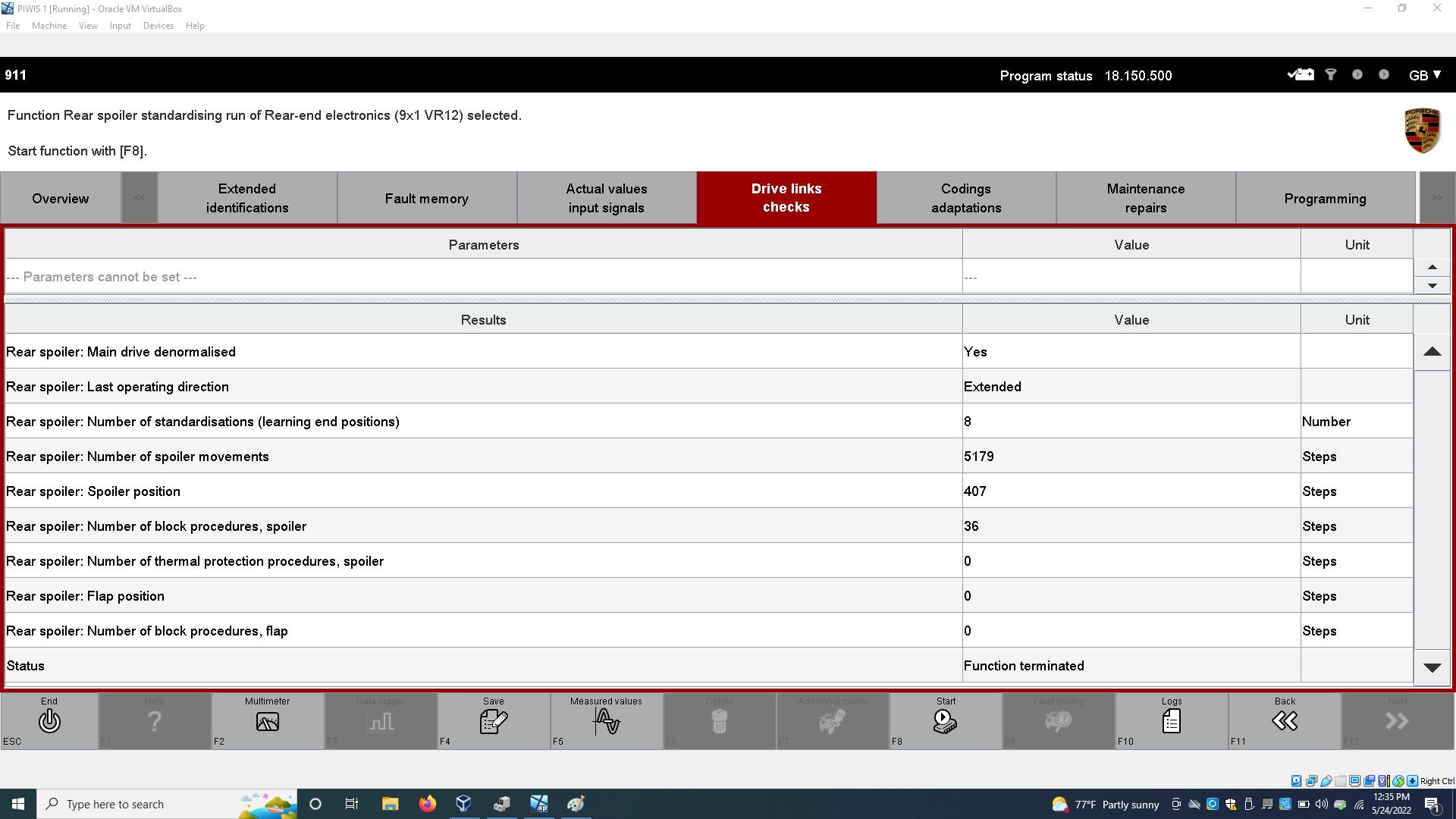 Now it's possible these codes were tripped when I started the car without the spoiler attached (that's also when I got the license plate light warning). I say that because I can run a "teach" function in PIWIS that shows the correct position of the spoiler as it moves up and down as show here: