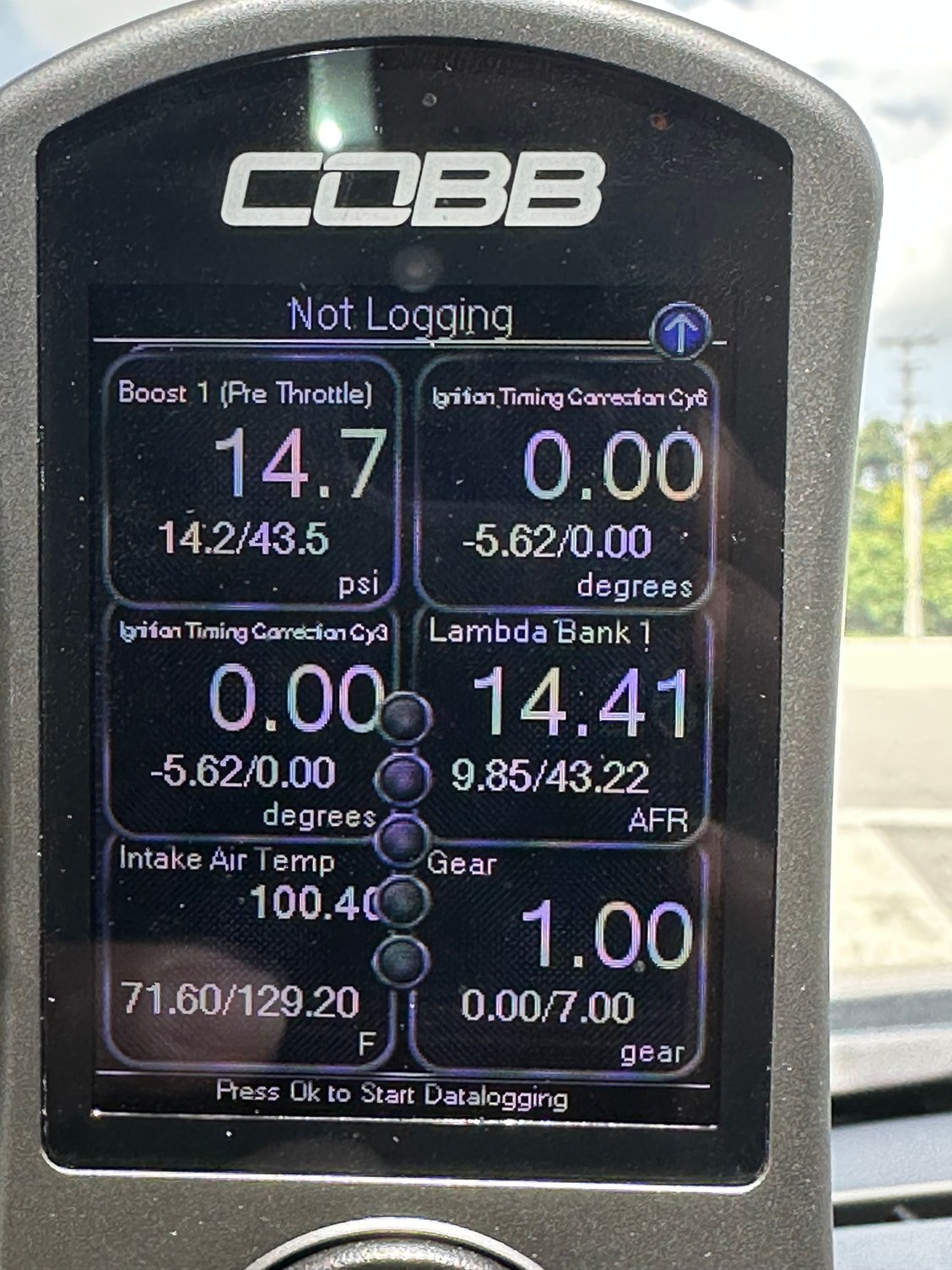 Max I started with a generic M Eng tune and have been working with Scott at M Eng to revise and tweak the tune. I think we did about 4-5 revisions. I send Scott a log and he sends me back a new tune after he tweaks it. I’m running about 28.5 degree of timing and ~24.5psi of boost on the top end. (If I’m reading the manifold pressure correctly minus atmospheric).