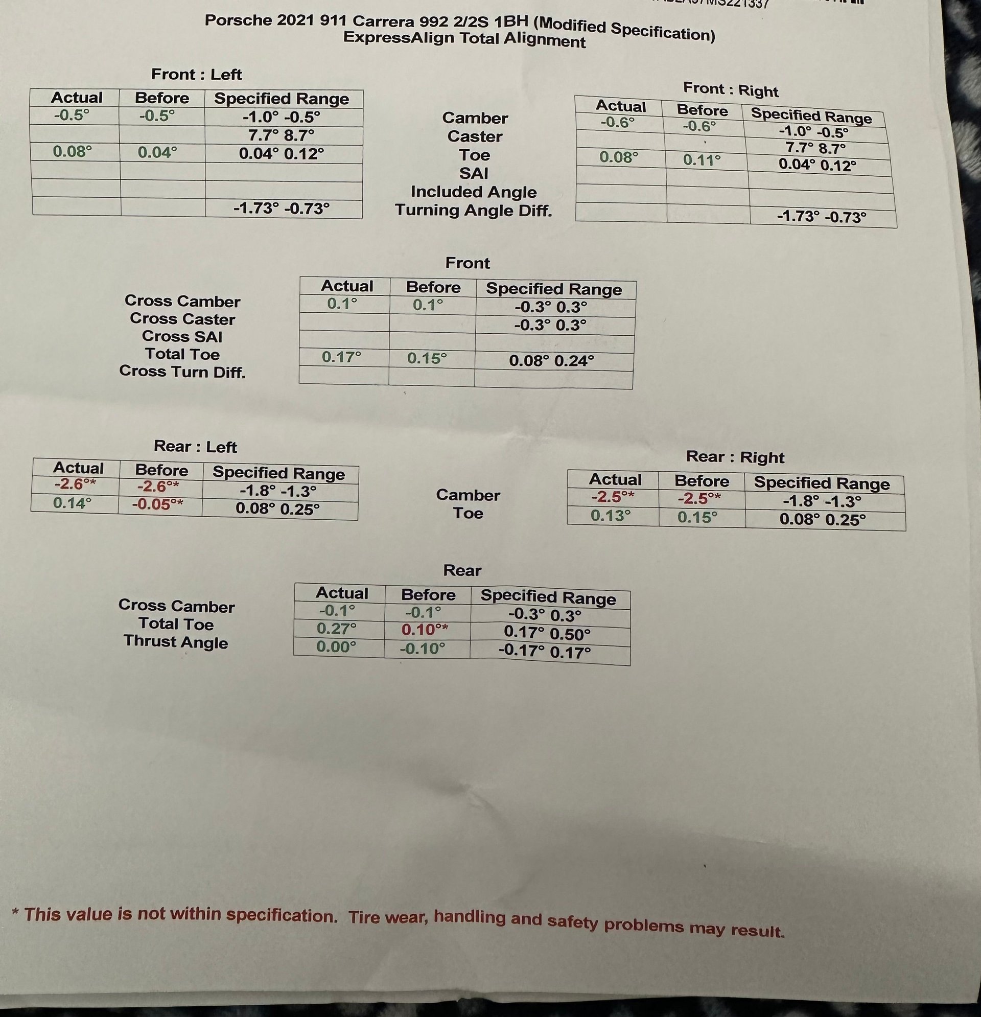 I just got my car lowered with Bilstein EVOs and 12mm spacers front and rear. It seems my rear camber was set too aggressive. The car is mainly for street driving. Thoughts?