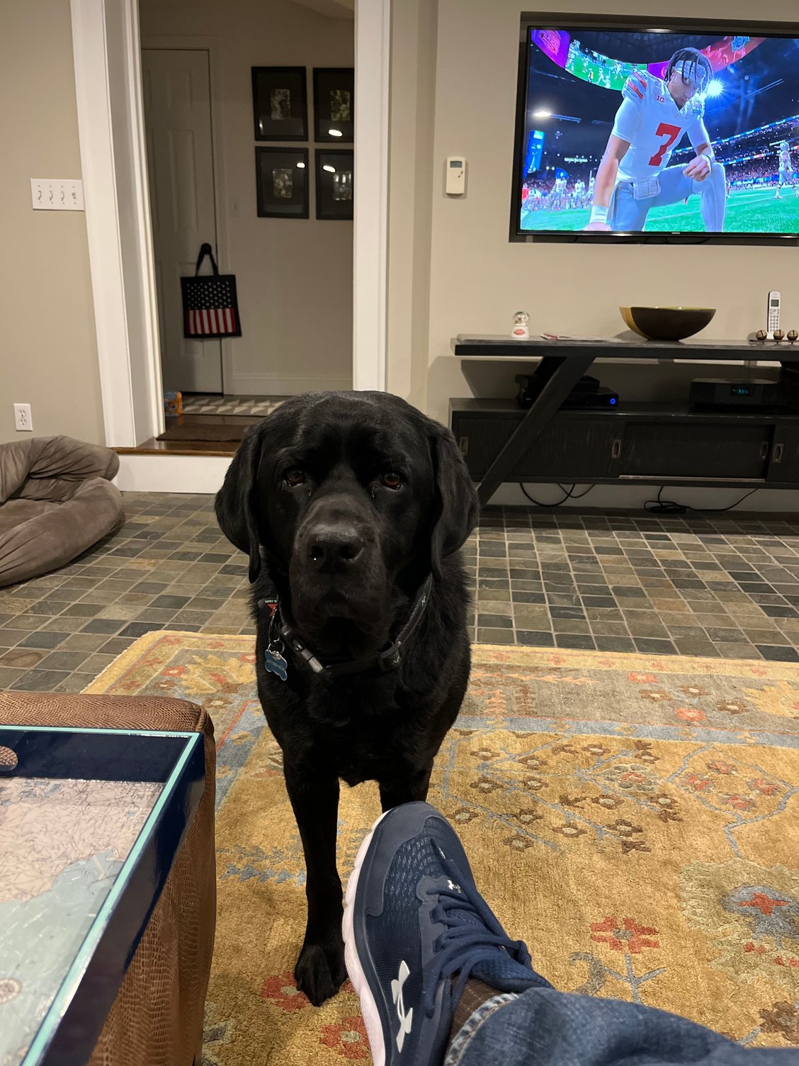 My personal fave is his holiday sweater (and yes it gets cold up here in NH, even the big dogs need a little coverage):