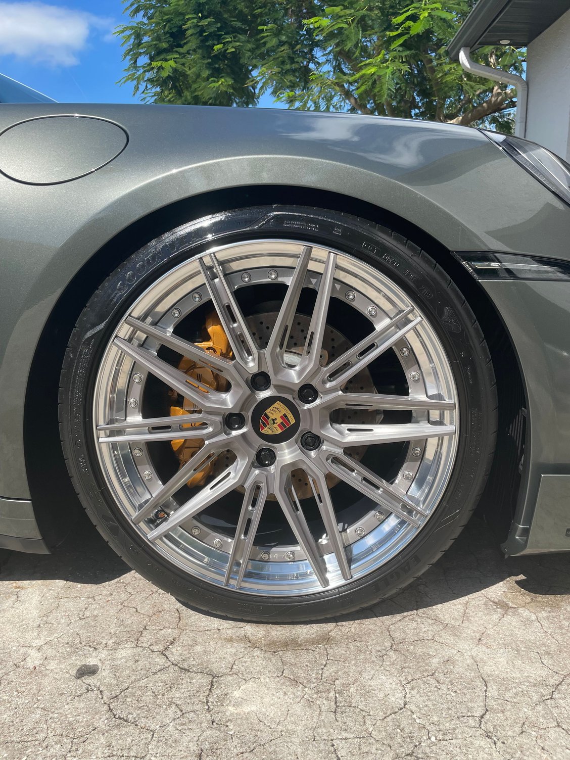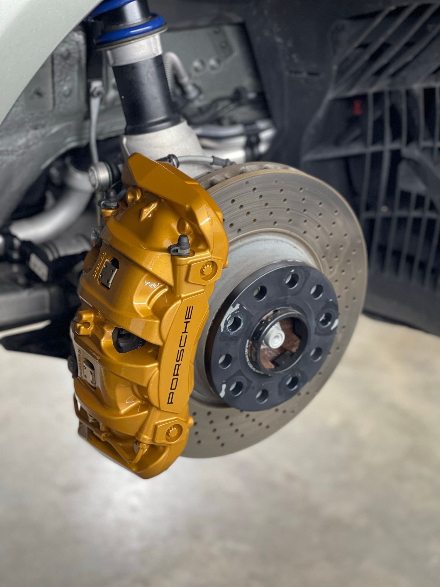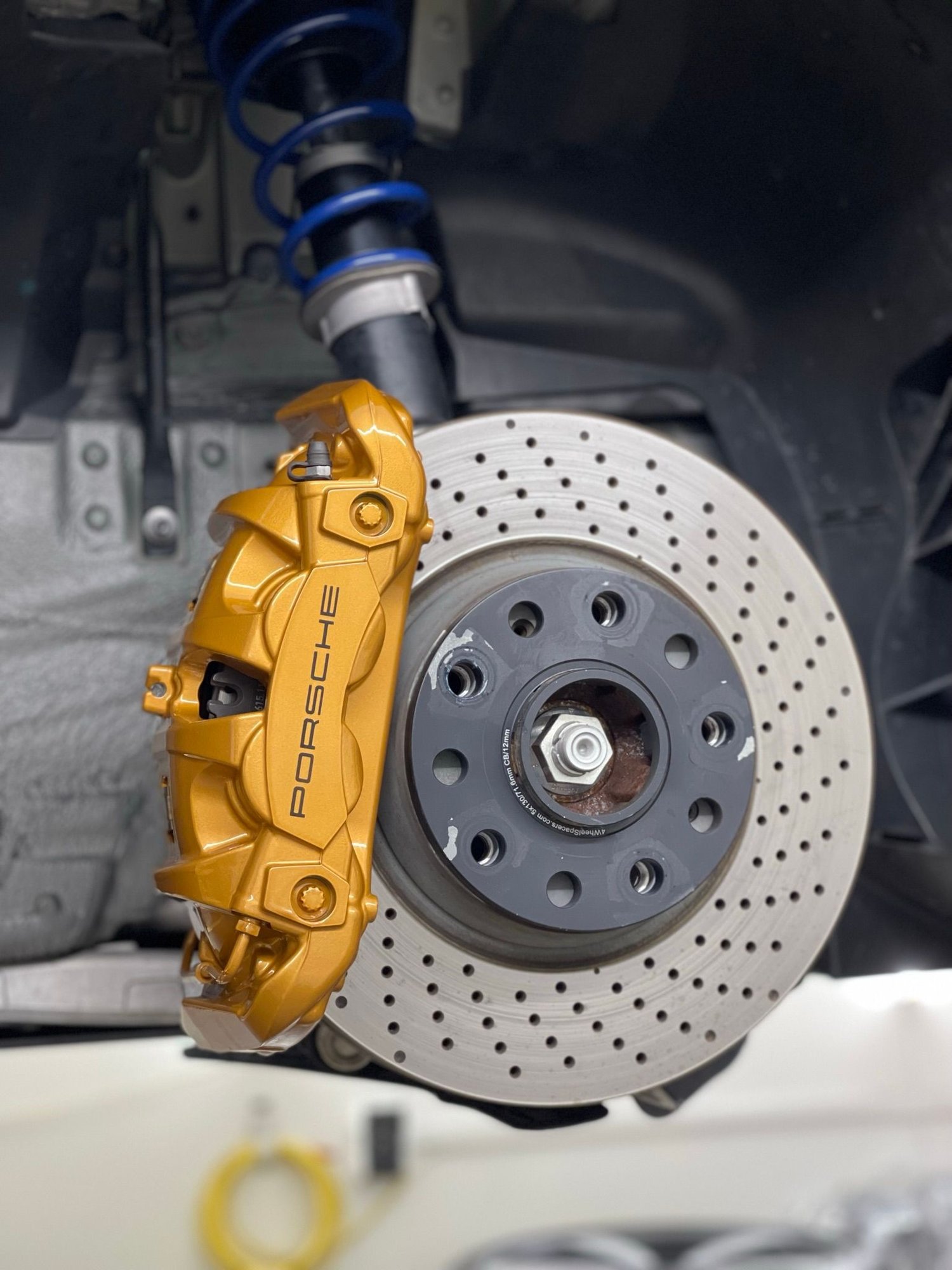 exactly- when done properly it will last. I guess when people talk about painting calipers they associate it with someone covering the rotors with a plastic bag and spray paint...pics from my install. Calipers get completely dissassembled and removed, prep, paint (multi layer) and final coat, then adding Porsche labels. We used OEM porsche color too.