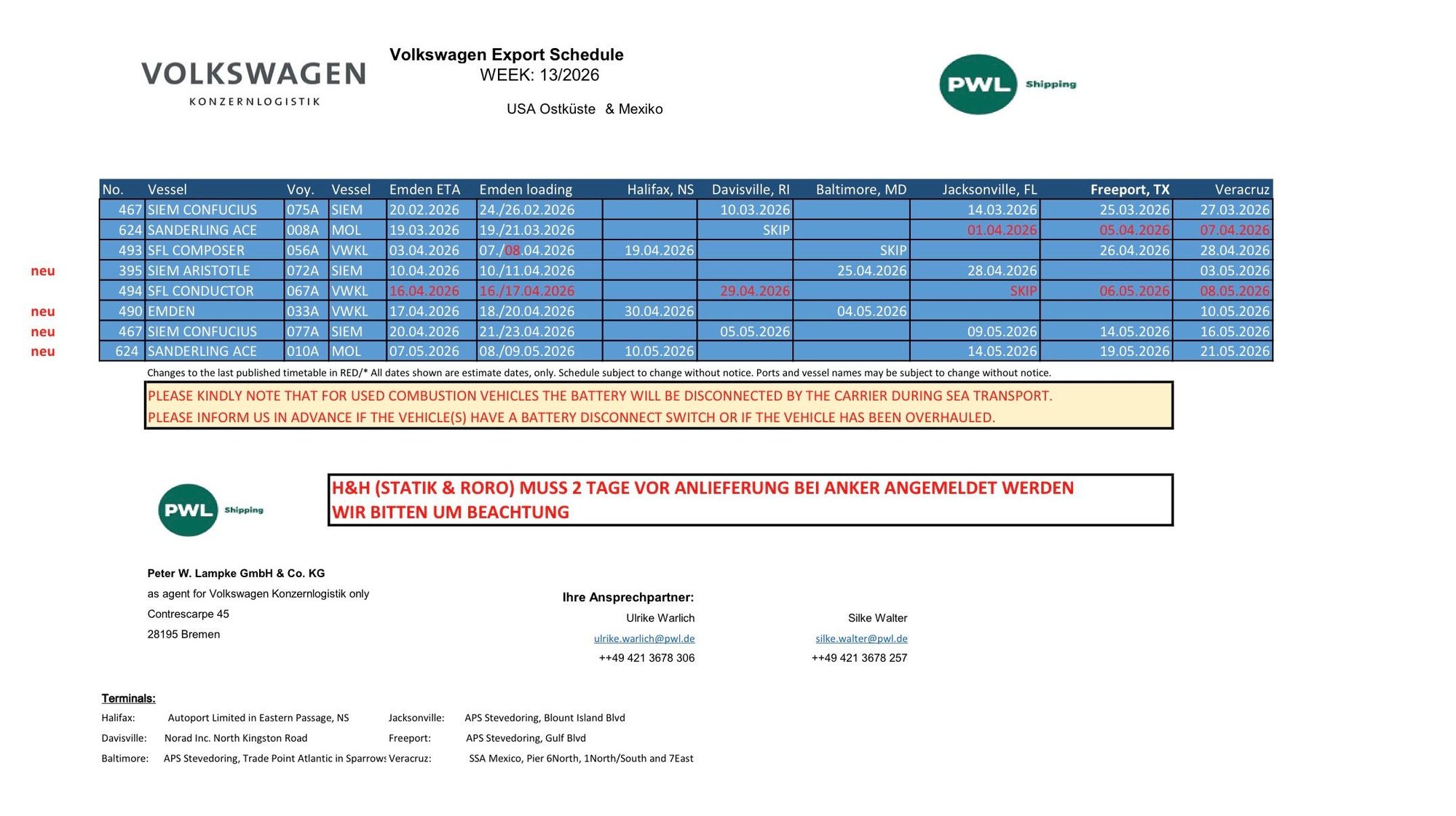 Scroll down to Shipping Portal, click Schedules and put US East/West Coast. Click Carrier and select VW Logistics.