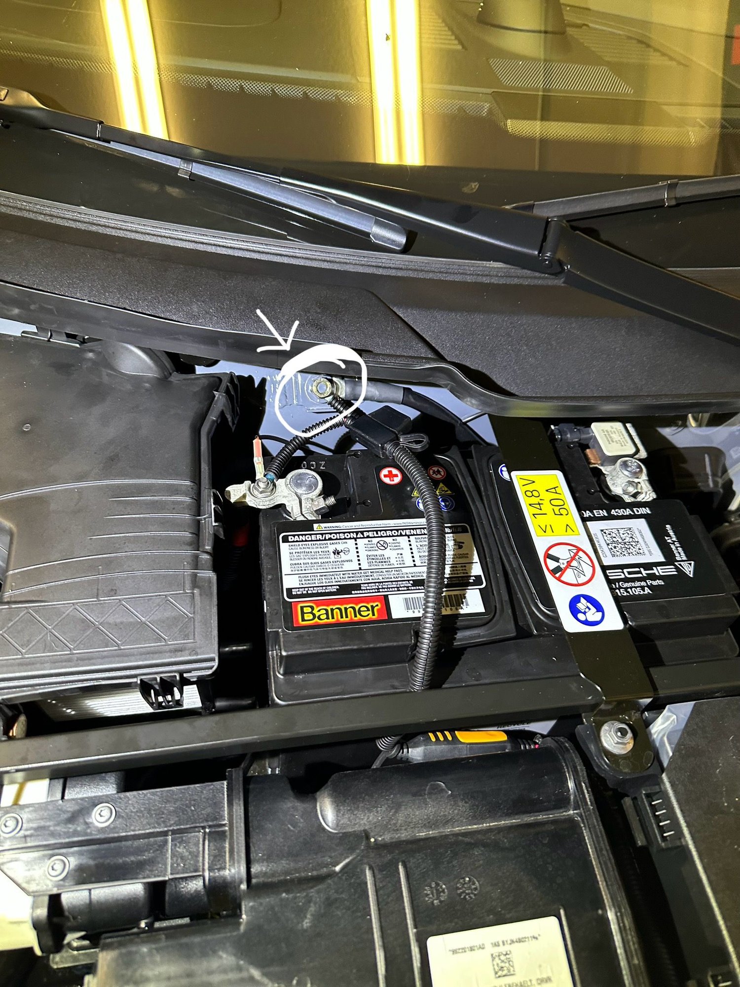 Instead, use the battery hold-down clamp nut as your ground which will give you enough length to run the plug under the cover to the base of the windshield. It will still be hidden from view but easily accessible from the drivers side so you can simply plug it in as you exit the car.