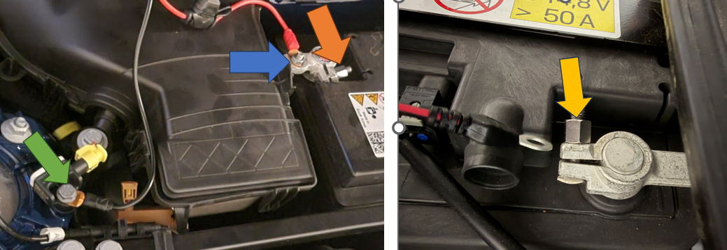 1. It may depend on the configuration of your battery connectors, but in my situation IIRC the nut was captive and nut marked orange in your photo didn't want to come all the way off. The one marked with the blue arrow was easier to access and required no modification of the eyelet.