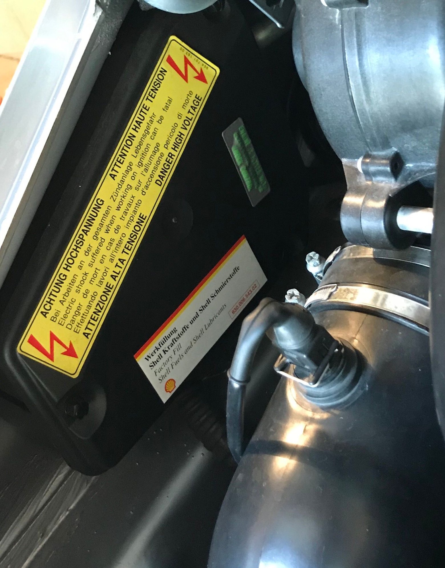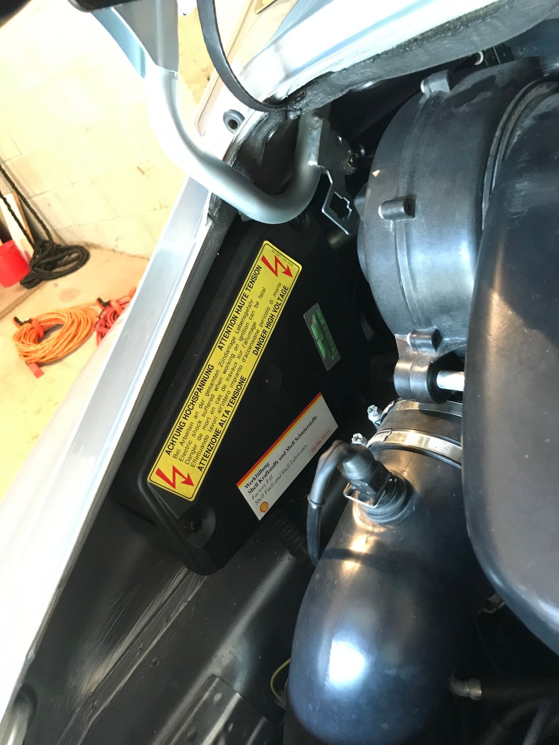 See the smaller white “Shell” sticker beneath the yellow “High Voltage” warning sticker. Located along the driver’s side of the engine bay.