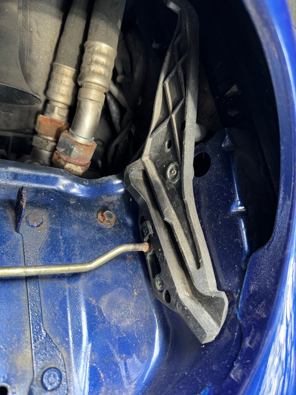 More than likely it is the plastic one on the side which attaches to the frunk side of the inner fender. The bolts are right next to the rod which locks/unlocks the headlight housing.