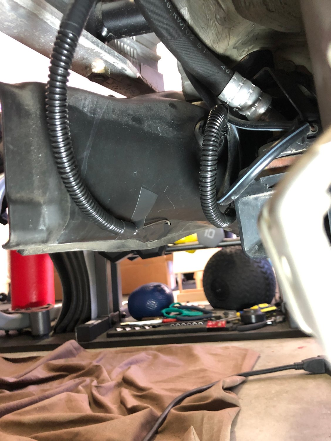 My solution. I removed it from the keeper and placed it in a loom. The end is taped to the passenger side duct. I can reach it from the far right large hole in the bottom of the bumper. It works fine and does not bind on anything.