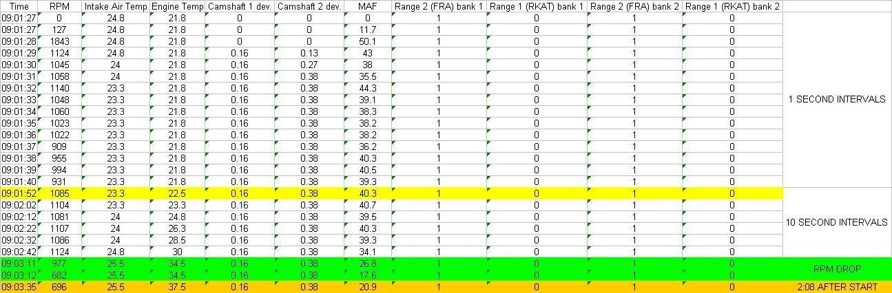 Here is another cold start with data spanning two minutes from the start. Yelow row is 25 seconds into it which is the first time engine temperature has gone up about 0.7C. Can those RKAT/FRA values really be that dead on? Based on Macasters theory that engine temp should go up 1 deg every second this may indicate that that coolant temp. sensor may indeed be waving bye bye.