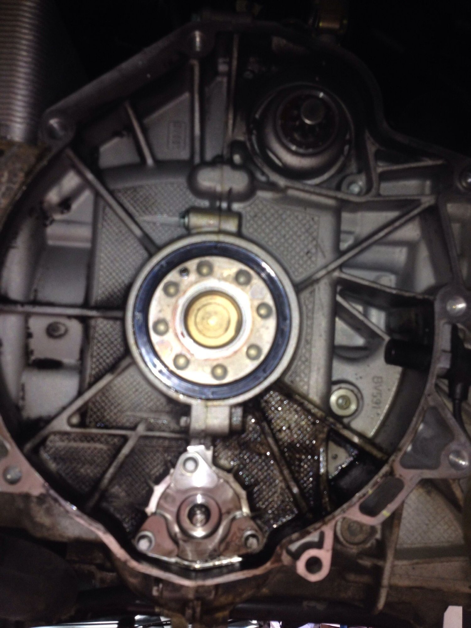 That's a crappy picture but from what I can see, the leak is from the rear main seal. IPhone cameras suck, use something else on Monday....anything but an iPhone....maybe a Barbie camera.