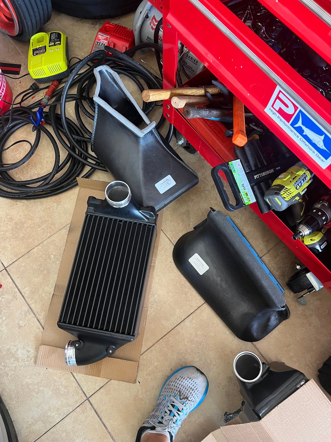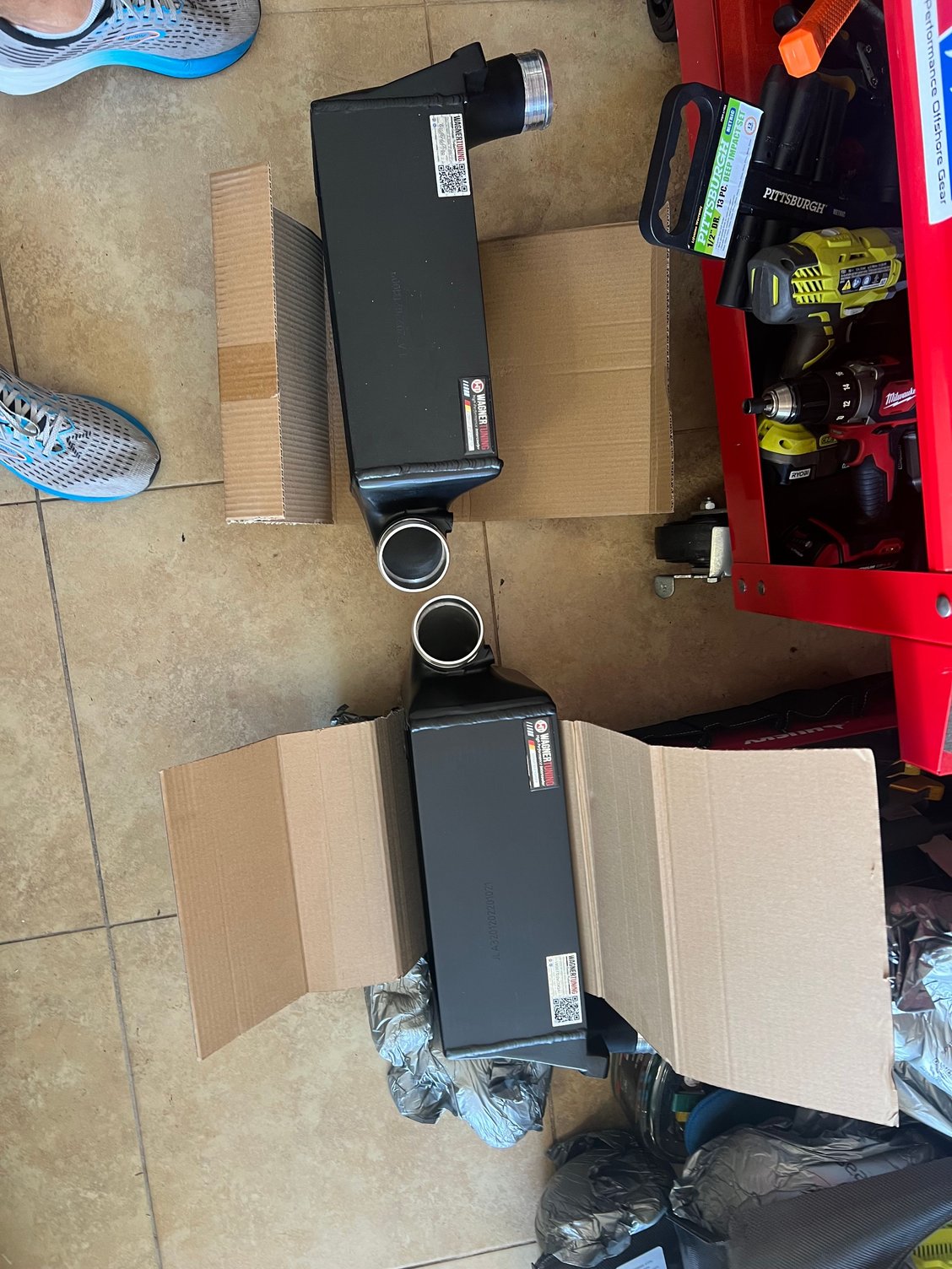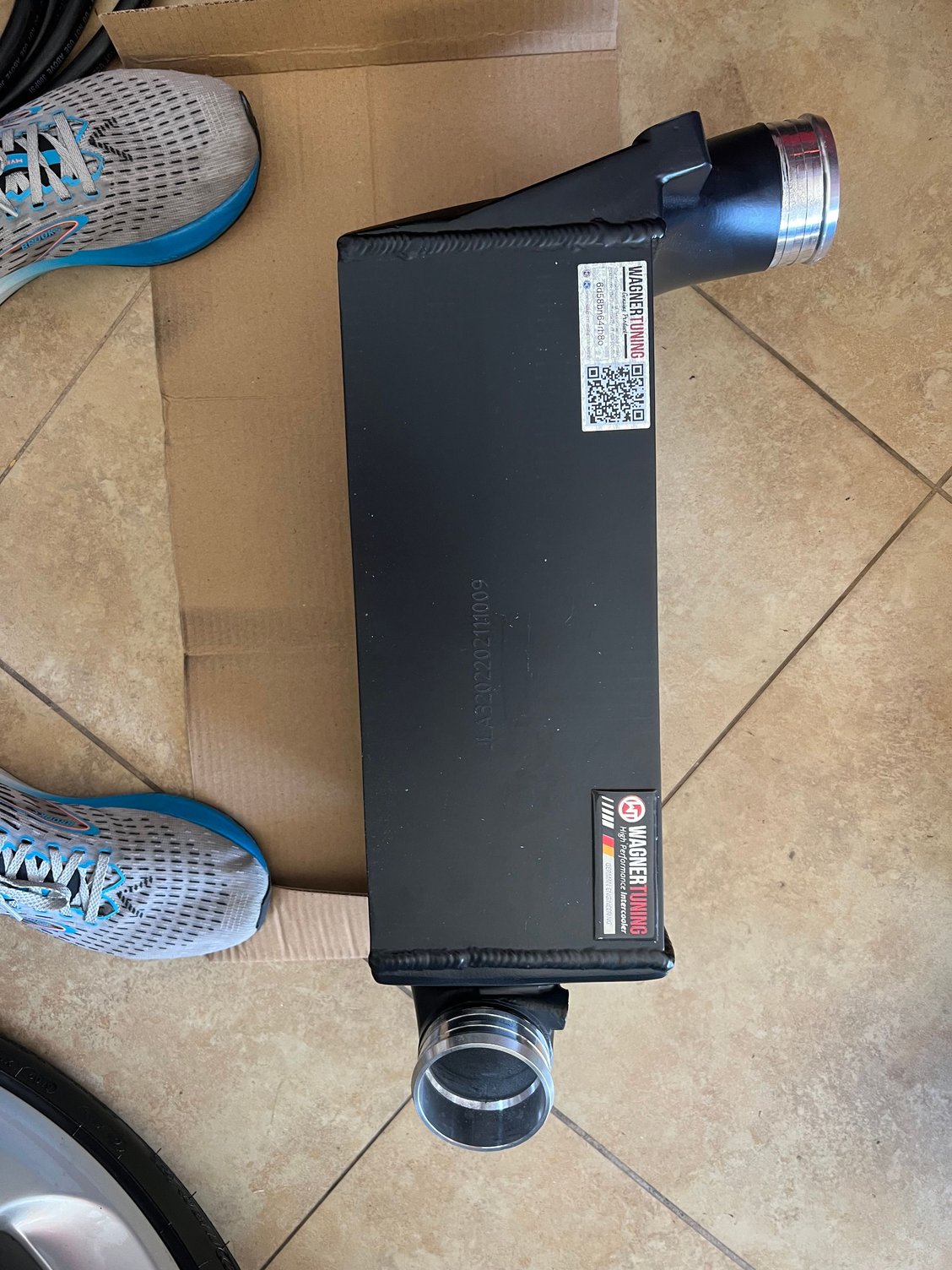 Well….Black Friday sale was too good to pass up so went with the Wagner big coolers and shrouds direct from factory. Shipping was fast, packaged superbly, quality is top notch and the paint or thermal coating is thick. Install was pretty straight forward. Removed the rear bumper , wheels, wheel loners , tail lights and the airbox. You remove the old coolers as an entire unit and dismount them from the factory metal harness. Carbon fiber ducts are a work of art and fit perfectly. Only pain was getting the new hoses lined up and mounted ( limited room and they provide much bigger boost hoses ( all new clamps and hardware to mount coolers is included ). Cf shrouds had double sided tape. Took me a couple trikes to line it up perfectly and they fit just right. I took lots of pics and captured fin density etc as others have asked. All installed and will wrap it up on the morning taking my time with the bumper..will,post pics in a few posts