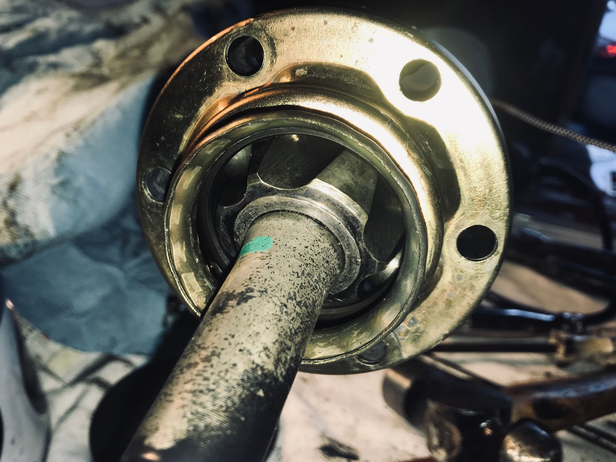 Can someone please tell me how to remove the inner joint from the CV shaft? See photos. Also, does the inner bronze lid come off of the joint (the outer obviously does). And one last question, when I am repacking the grease into the bearing, am I supposed to fill the boot with grease also? Thanks for any in put!
