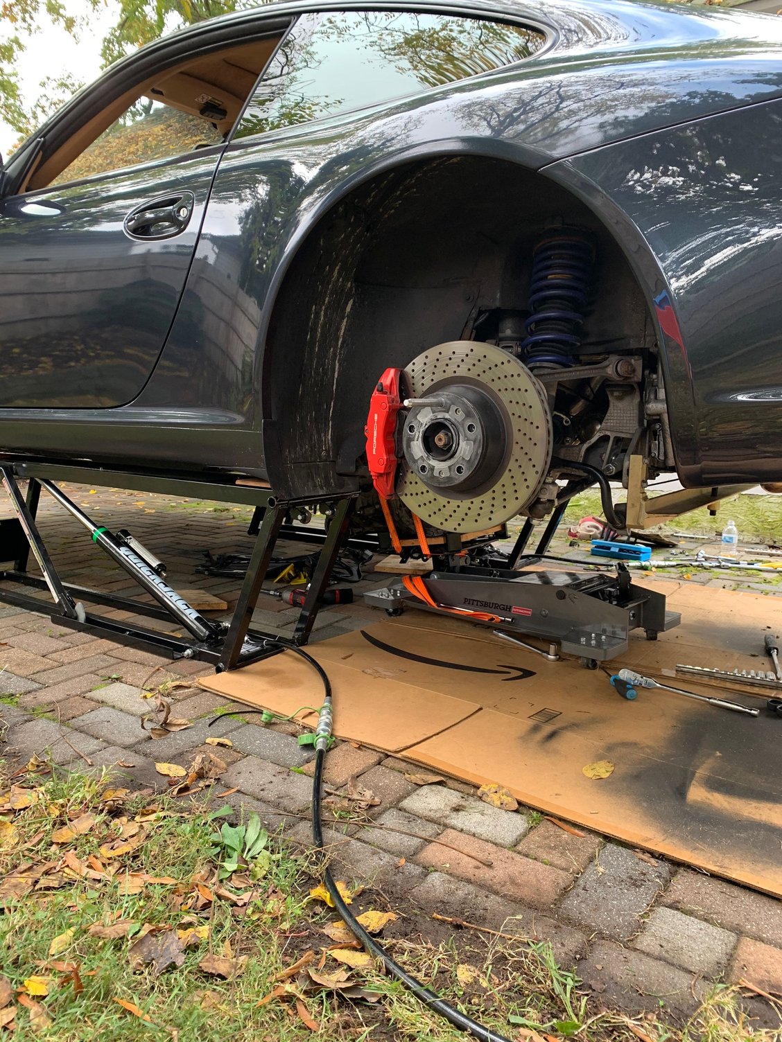 I use the Jackpoint system and really like it. http://www.jackpointjackstands.com Just jack it up with the back factory point which will lift the entire side of the Porsche and slide the front one under and lower the rear and do the other side, fast and easy.