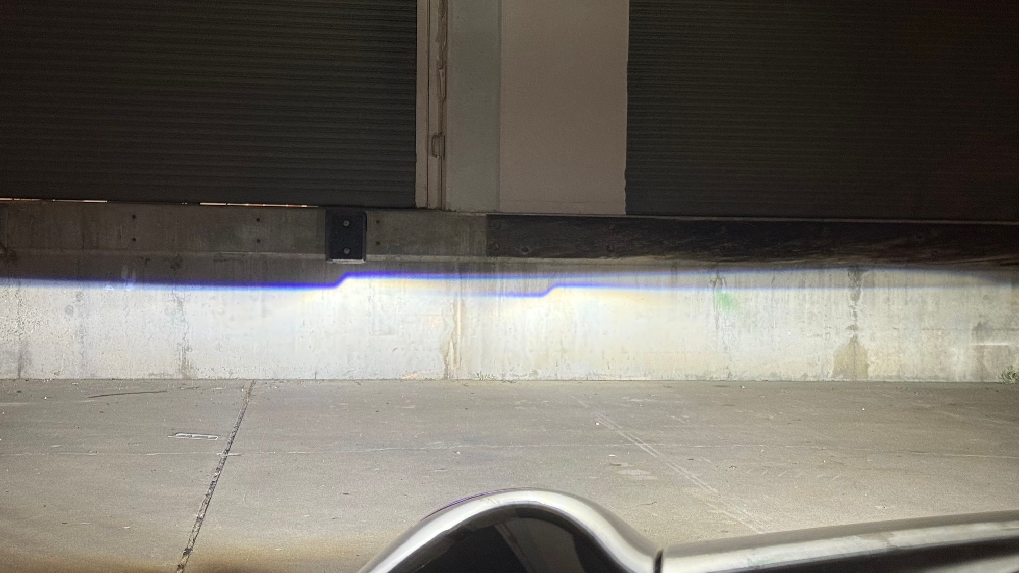 - The headlight output is incredibly sloppy, as shown in the picture. The cutoff is harsh and not parallel, the steps don't align, and the right headlight puts a dark spot right in the middle of the road.