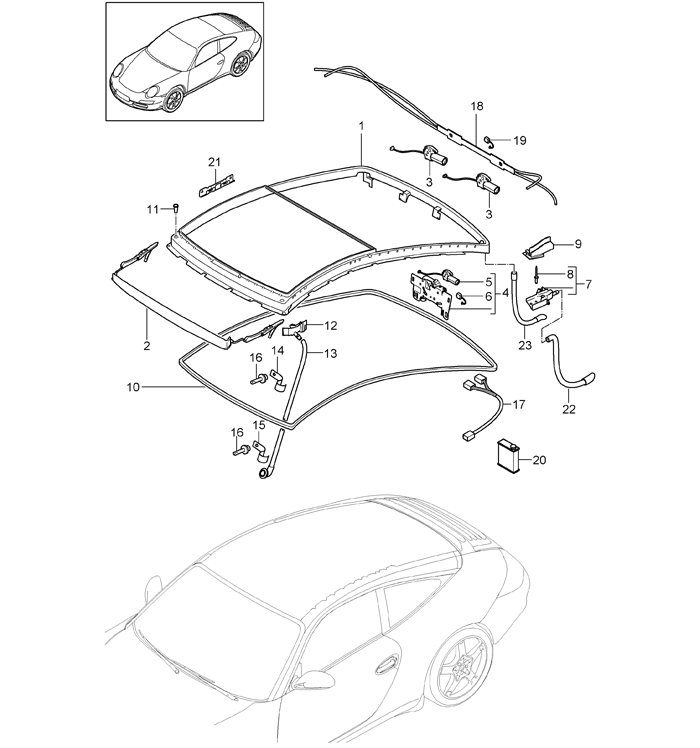 Targa brethren! My rear carpets got the dreaded roof soak, especially on the passenger side. There's no pillar wetness so I'm assuming the culprit is related to the drains at the corners of the hatch. Tried snaking them out but I come to a stop about 2 feet in. I'm assuming this is the "end piece guide rail" (#7 in the illustration). Does anyone know where the outer hose drains to? There are plugged drains above the heat shield and in the rear wheel well (these are drain spots for non-Targas). I've checked a number of threads both here and abroad, but can't find anything specific to the 997 Targa.