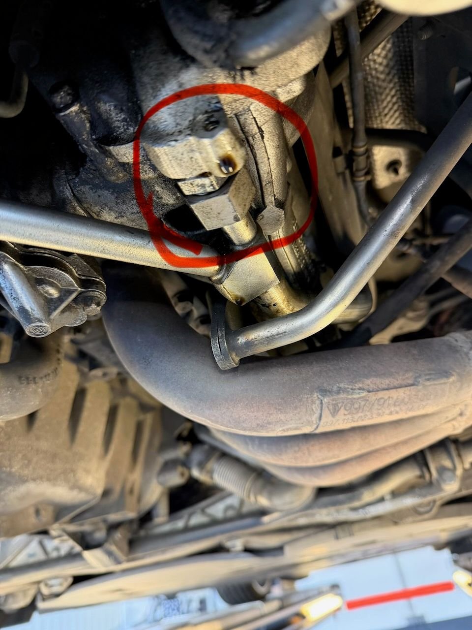 It appears that it's coming from closer to the front of the car (rear of the motor) vs where you circled. When driving, the wind would have carried it to the area you circled. The shop should be able to identify where it's coming from and give you a quote, but it wouldn't prevent me from moving forward with the car if all else checks out.