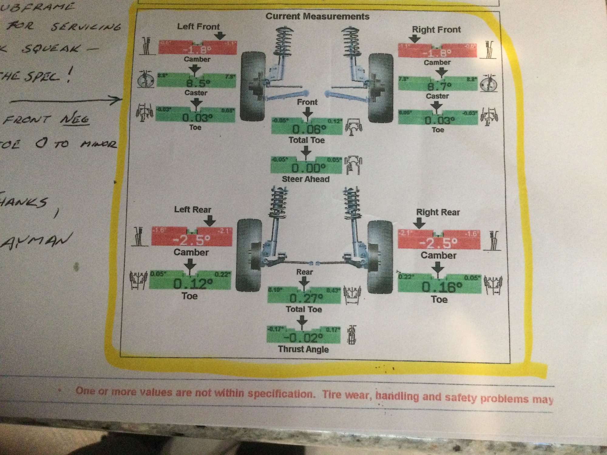 I remember seeing a post on alignment specs away back, probably almost 2 years ago, and I can't find that post. Can someone help me regarding a good autocross alignment spec. My thoughts are 2.5 neg front camber, 6.25 pos. Caster, total .28 degrees (.14 each side) toe out and 2 degrees neg rear with a total .14 degrees (.07 each side) toe in.