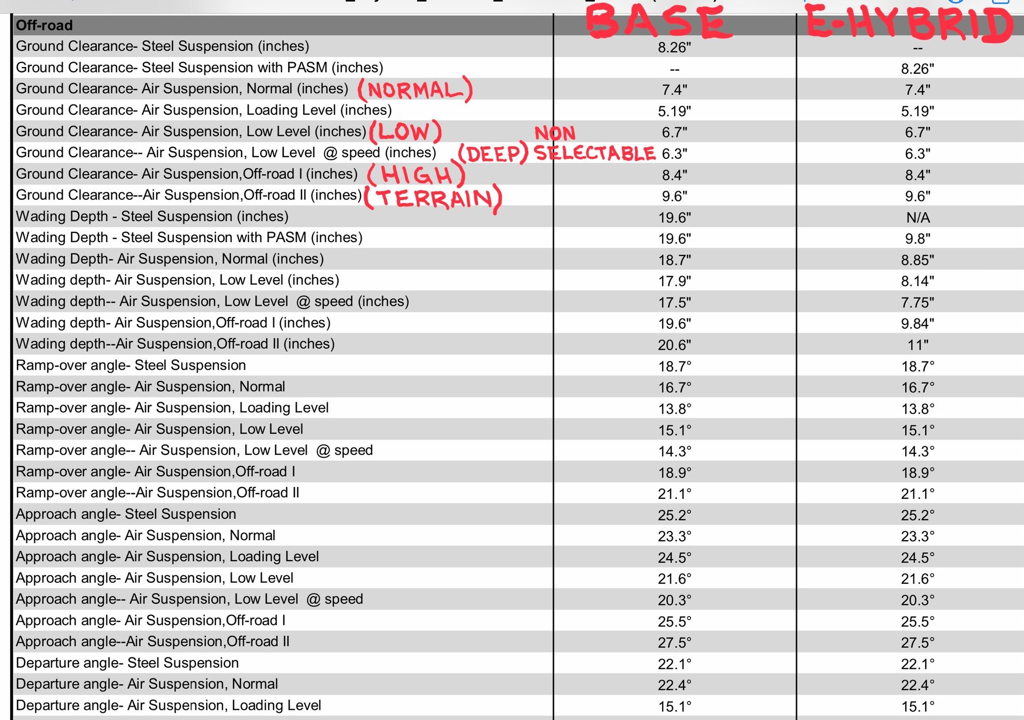 Ground clearance difference between Low (6.7”) and Terrain (9.6”) is almost three inches.