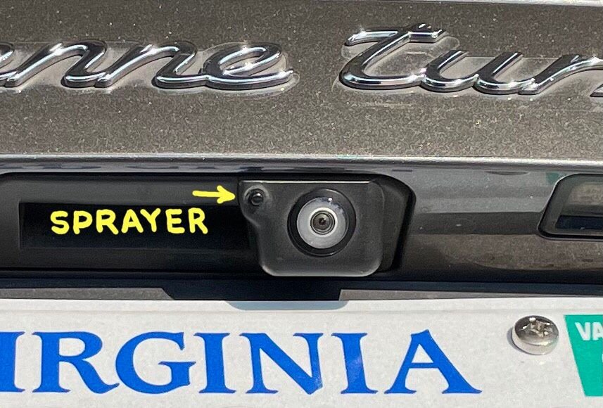 More trivia — when you wash the rear window, the rear camera lens is cleaned with a spray jet. A leaky spray jet valve will allow dripping and causes blue streaks running down the license plate and bumper as in this thread:
