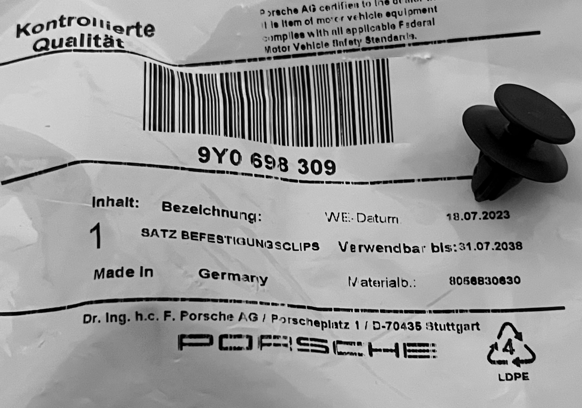 Here is the repair kit. However the "repair kit" name is exaggerated. It is the set of only 3 clips but in Porsche price. Around $10 per small, one piece, plastic clip, $30 for the entire "kit" . Such a things possible only in Porsche.