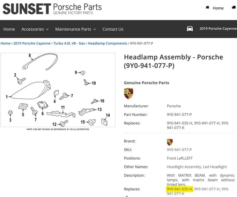 Crazy story. I bought a 2019 Cayenne S with 24k miles on it. It's immaculate. Driving around the first few days I notice that the headlights don't turn with the wheel. This car has Premium Plus package with the matrix PDLS+ lamps, so it must be an electrical problem and the aftermarket warranty will take care of it. I take it to the local dealer and guess what they tell me? The headlights have Chinese markings on them. So, at some point the prior owners replaced the OEM lamps with something less. The seller (car dealer) is working with me on getting the right ones in there and I'm talking to a few dismantlers. The problem is figuring out the part numbers so I don't put "less than" versions in the car. In all the cases, I'd buy full assemblies with the modules.