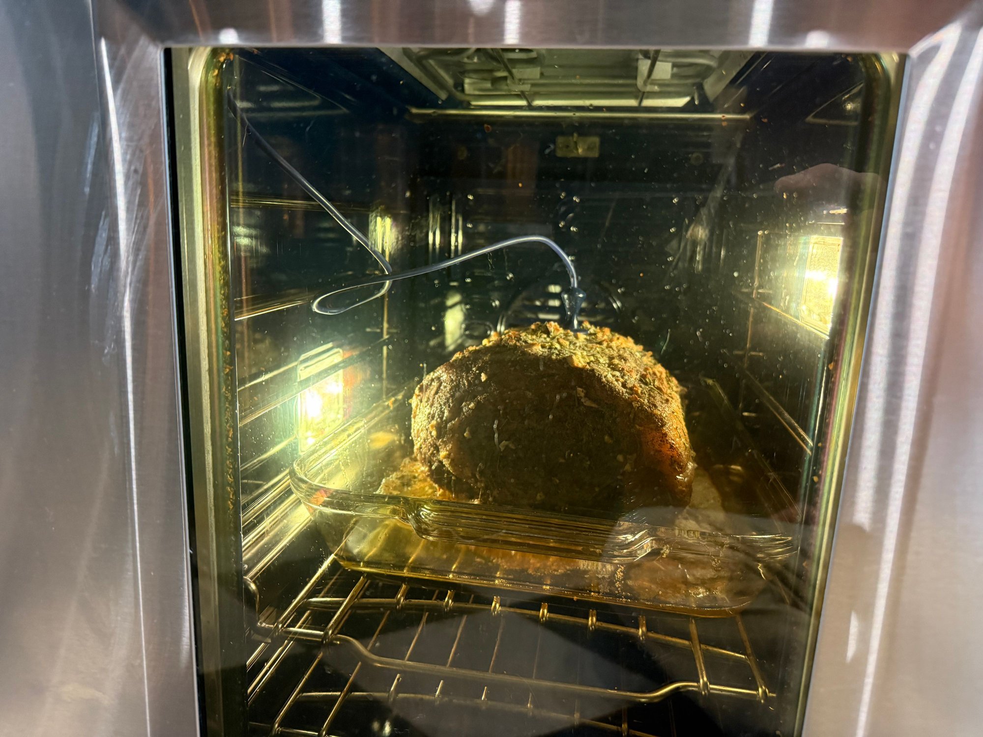My prime rib was good but did not go as planned. Pulled at 125F and set aside for 30 minutes with the intention to sear for 5 minutes at 500 after. But at 30 minutes a different probe showed 150F, way more than the 10F expected rise so we did not risk more heat from a sear. We did tent the meat in tinfoil while it was out and maybe that was the error. Could also have been a discrepancy in readings from the Wolf stove probe and the Oxo standalone probe — we did not compare them but should have. It was really good but would like to try the reverse sear and missed the opportunity this time.