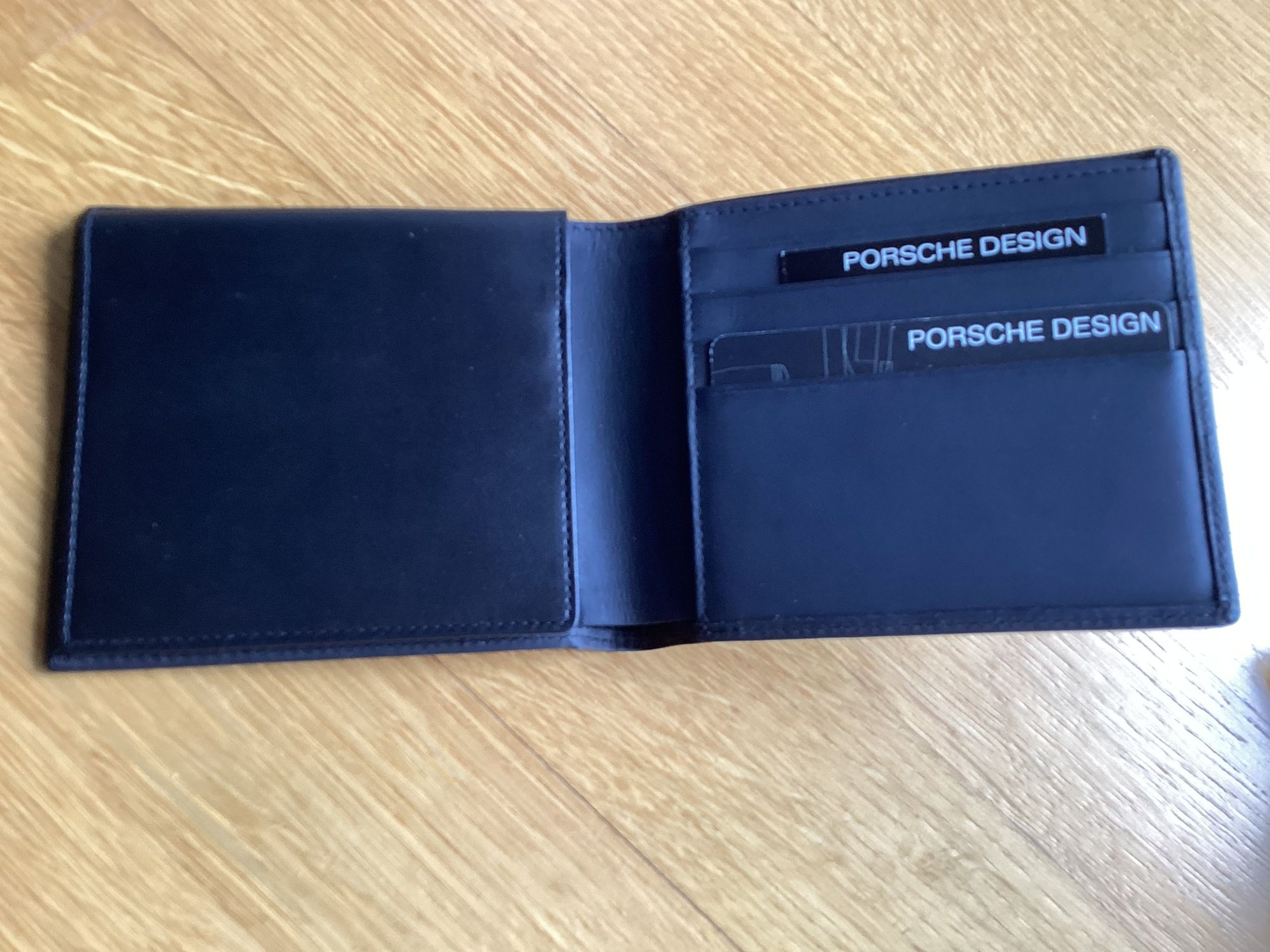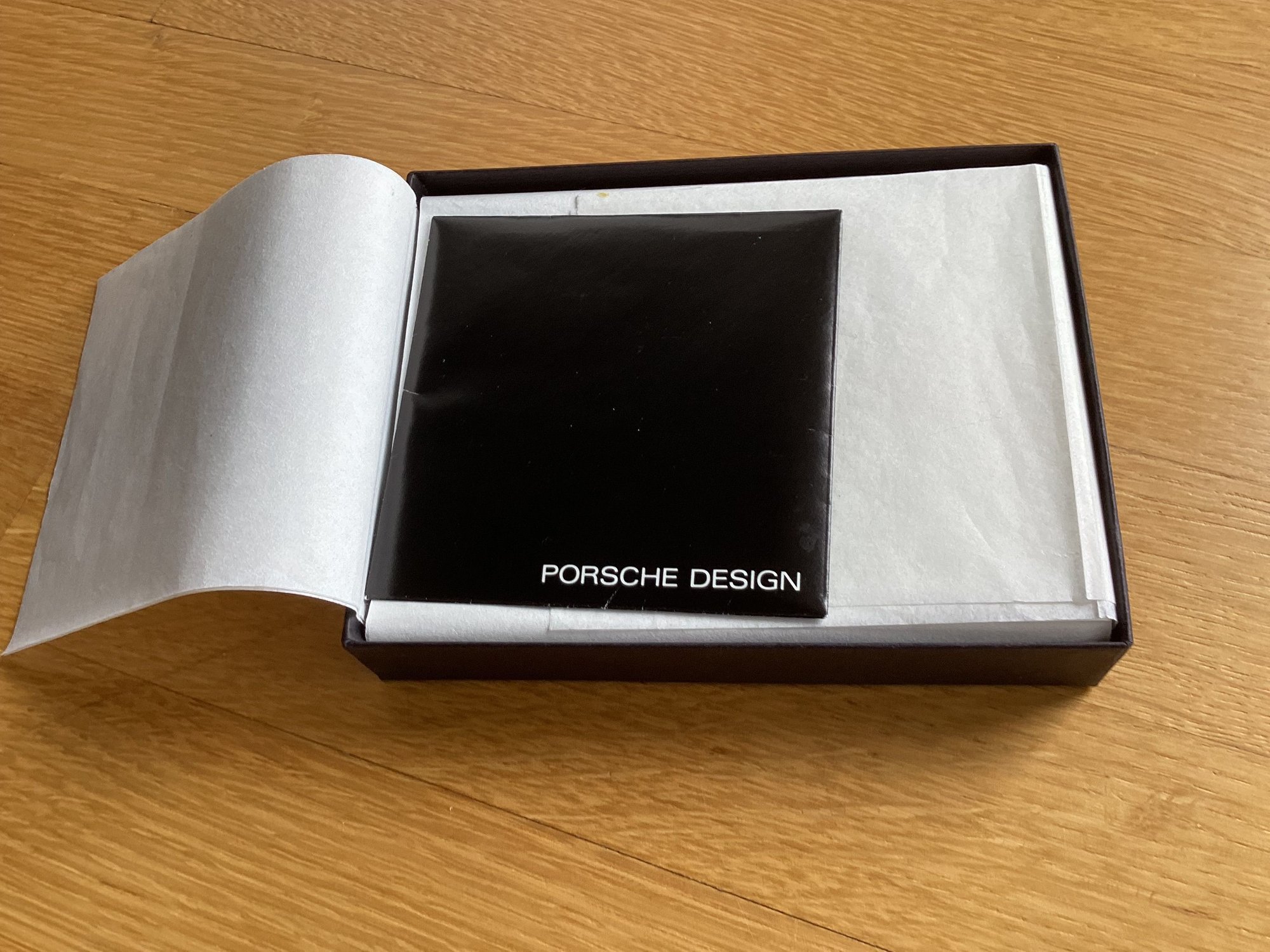 Vintage beautiful original Porsche Design trifold black leather wallet in original box etc.