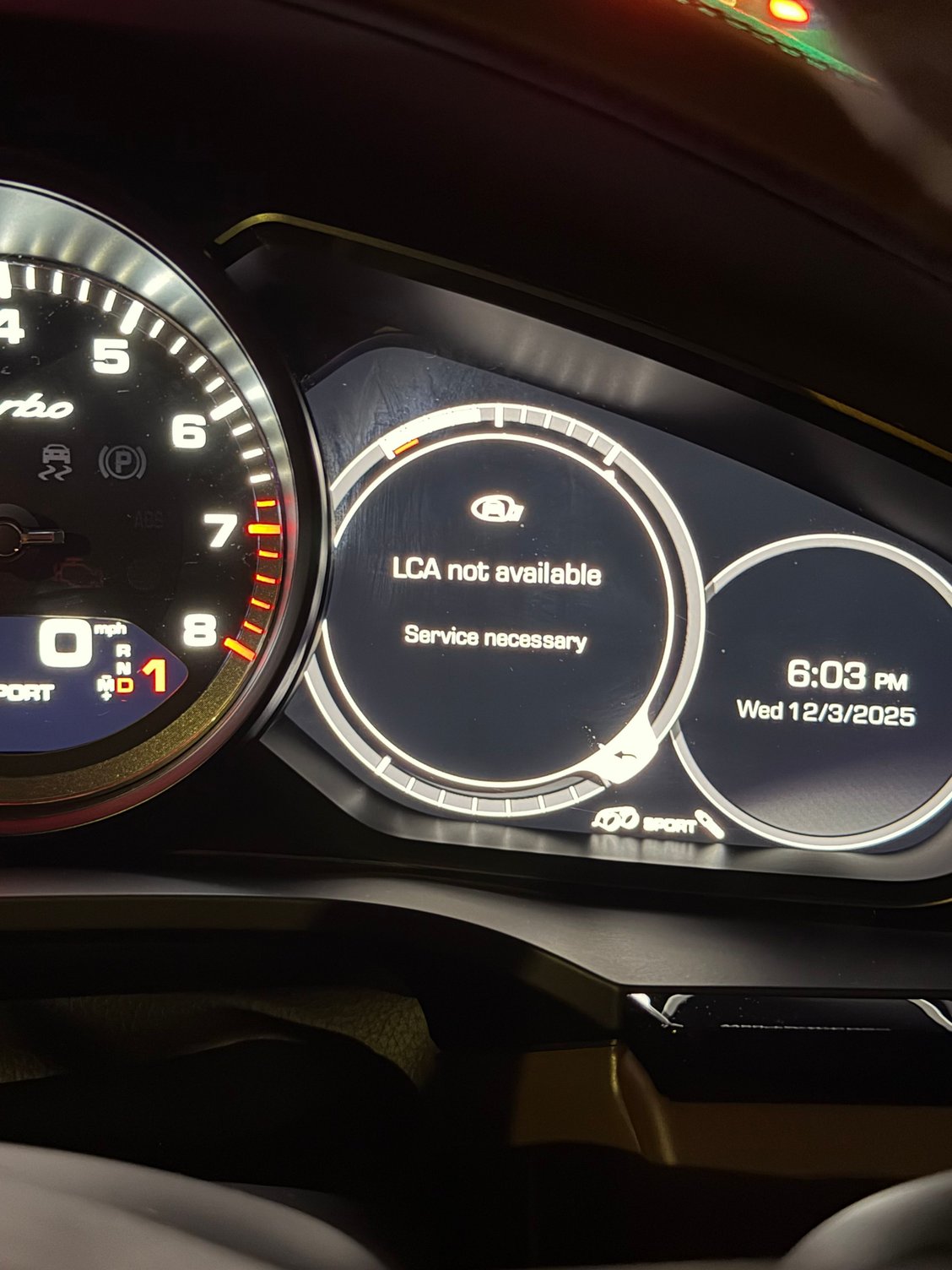 Concurrently my Cayenne Turbo LCA system displayed a “LCA error, take to workshop” message and that I did. Also got a screw in passenger rear, which was maybe a month old tire, and insurance covered it, paid for install only, and instrumentation said “add 2.1qts oil to engine” and they did.