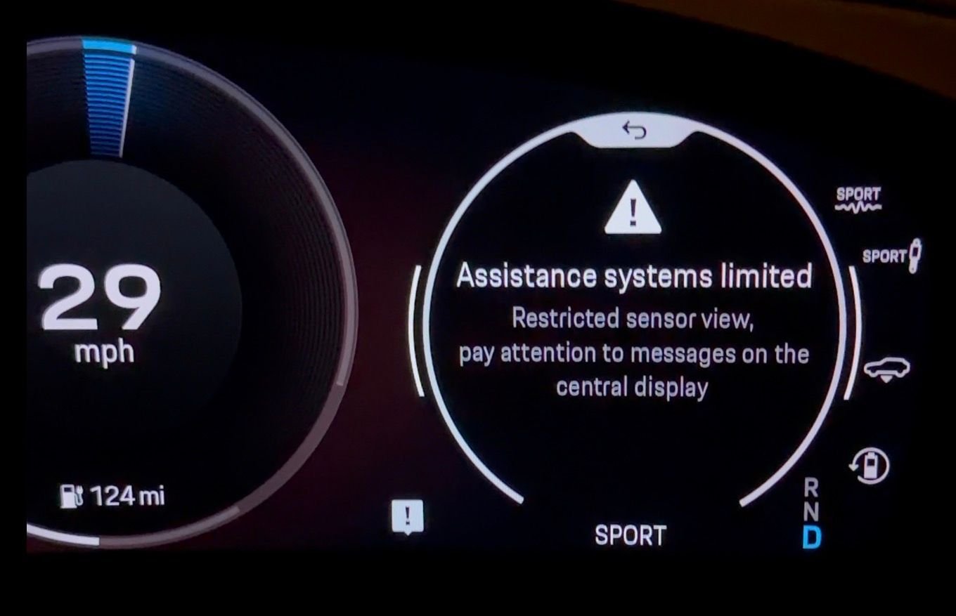 Car went back about 3 weeks ago, suddenly displayed “drivers assistance system unavailable, safe to drive”. Called my SA and they picked it up and dropped me an electric loaner, which we drove a week, and its PCM went black while driving it. Hmmmmmmmm. SA and tech called this a “white fault” that is from obstructing the sensor in front, and no need to despair, car is ok to drive.
