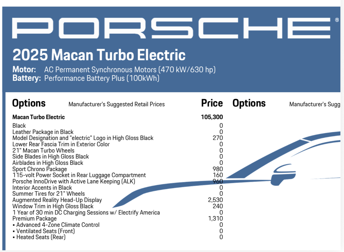 Picked up my Macan Turbo EV today. Looks, feels, and drives like a Porsche. It's fast, but not too fast (acceleration is less pronounced at high speeds). I'm happy (so far) with the purchase. Kind of reminds me of the 992.1 Turbo S.