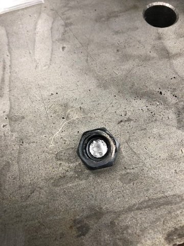 Scott. He used to be a professional welder. Brace in place. Right side of car. Note one nut and one bolt Scott welding It got plenty hot Nevertheless, welded nut wouldn't turn the threads and it snapped off again. Actually, twice Clean snap off Still some threads left but we couldn't get it to turn. Plan B, prepare for drill and tap So, ground off flat And, of course, the bit broke in the hole. And, of course, it was a _itch to get out. Drilled. Then drilled more to just short of the thread diameter. Tapped and ready for new bolts. Used neverseize and treated them tenderly