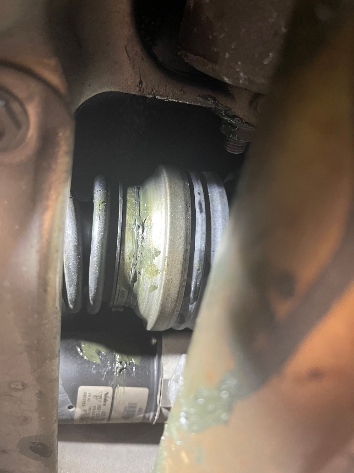 The inner joint appears to be a CV type joint/bearing since the shaft bends right there. Clunky, grindy noises are pretty indicative of a failed CV joint, and it could be causing more heat and pressure to force out the grease. That said, I'm not a CV expert and I don't know a lot about the AWD driveline yet. I'm just trying to research and help because I can only assume I'll have to deal with this myself sooner or later. Hopefully someone more experience can chime in and verify.