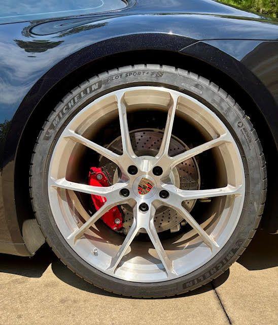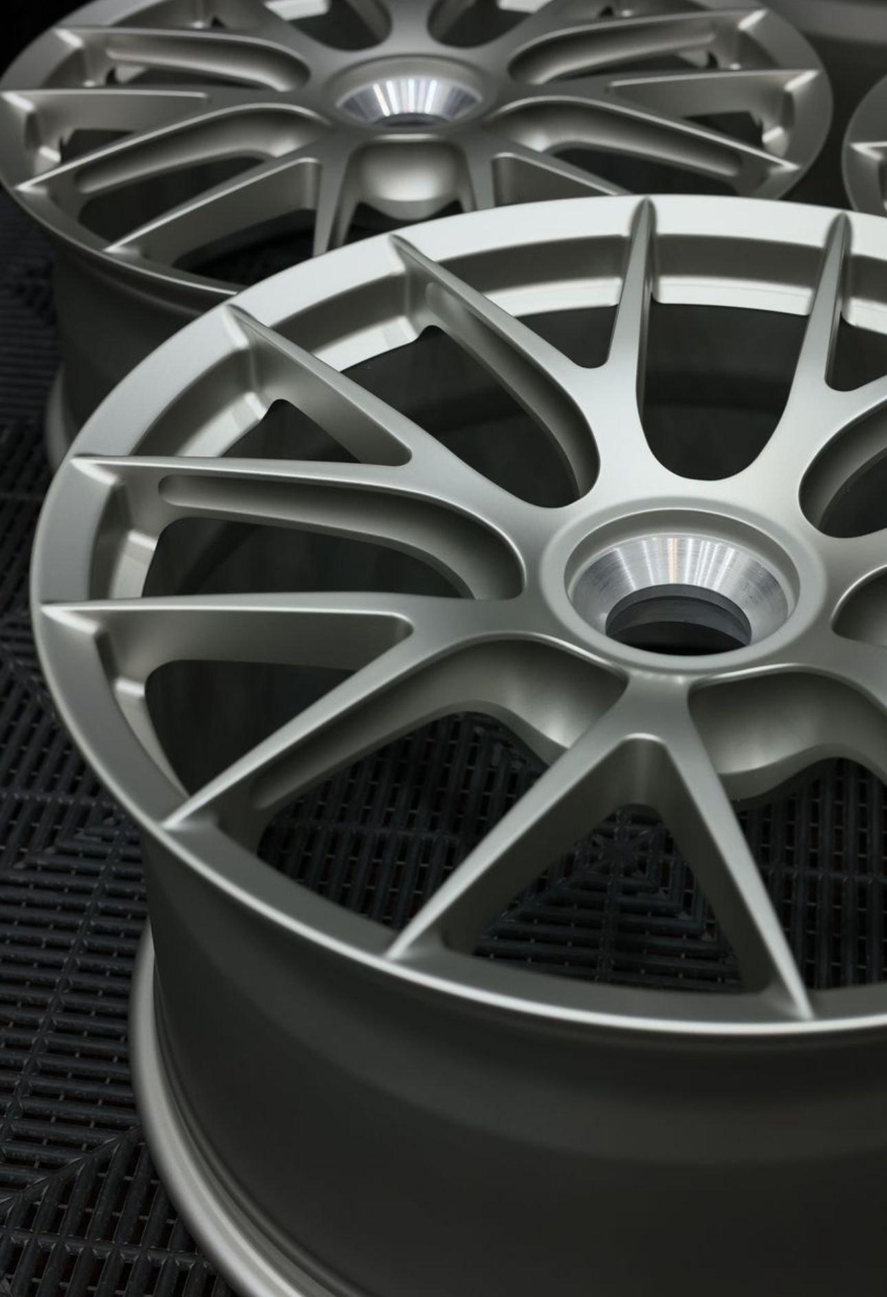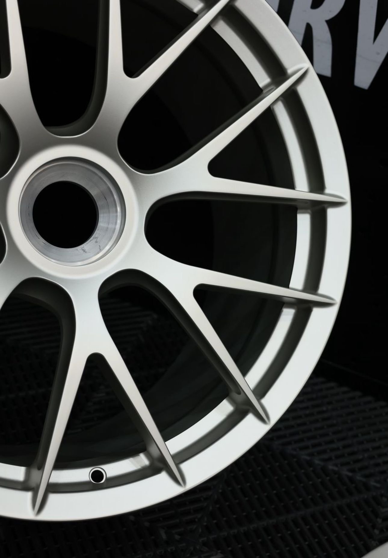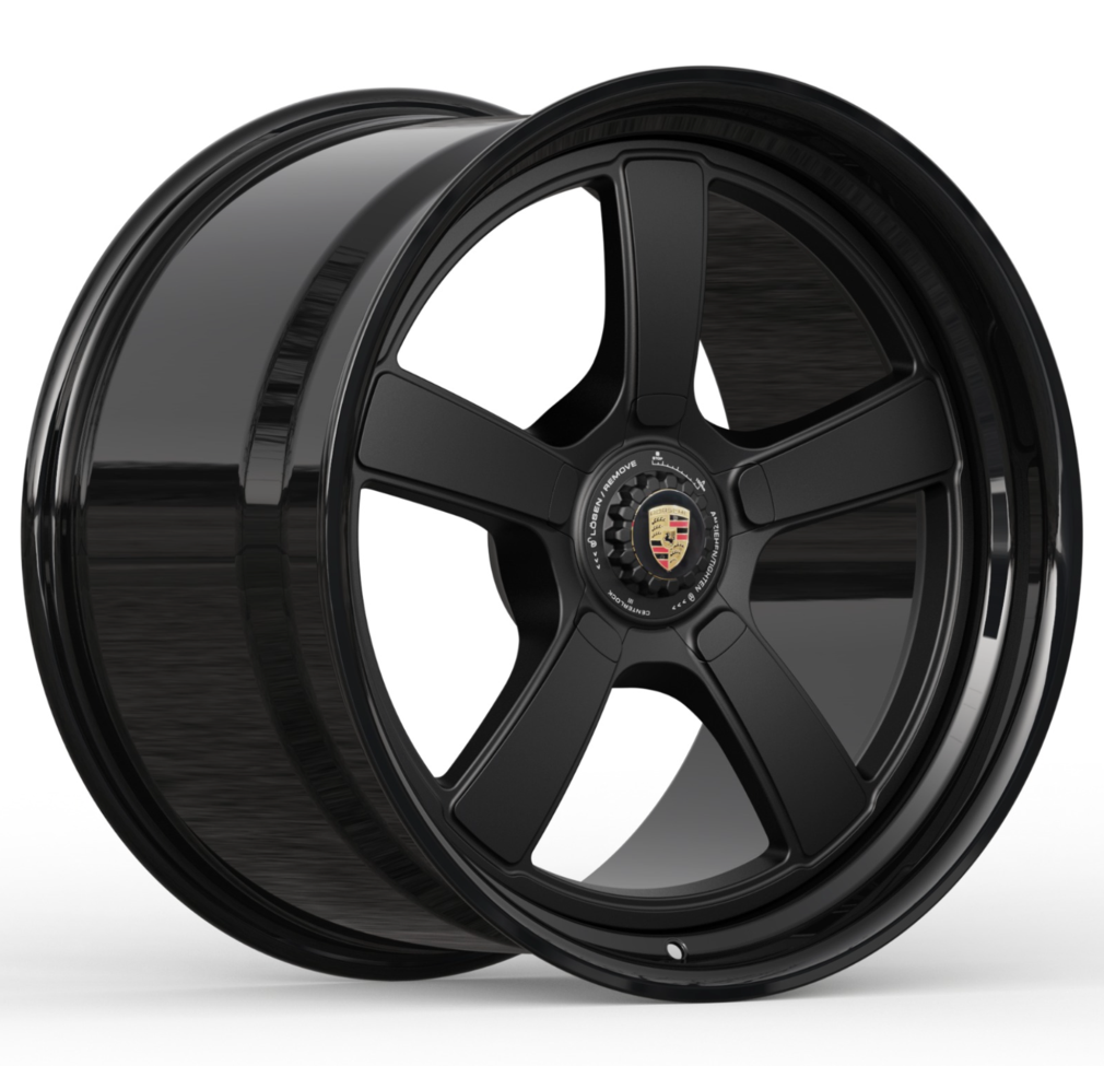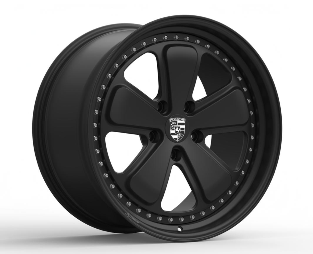 A set in progress, a 992.1 OEM GT3 wheel design adapted for a 5-lug 992 C4S. We offer faux center lock options in nearly any design, available in both monoblock and multi-piece configurations. This set features a faux center lock that neatly threads into the center bore for a clean, cohesive look.