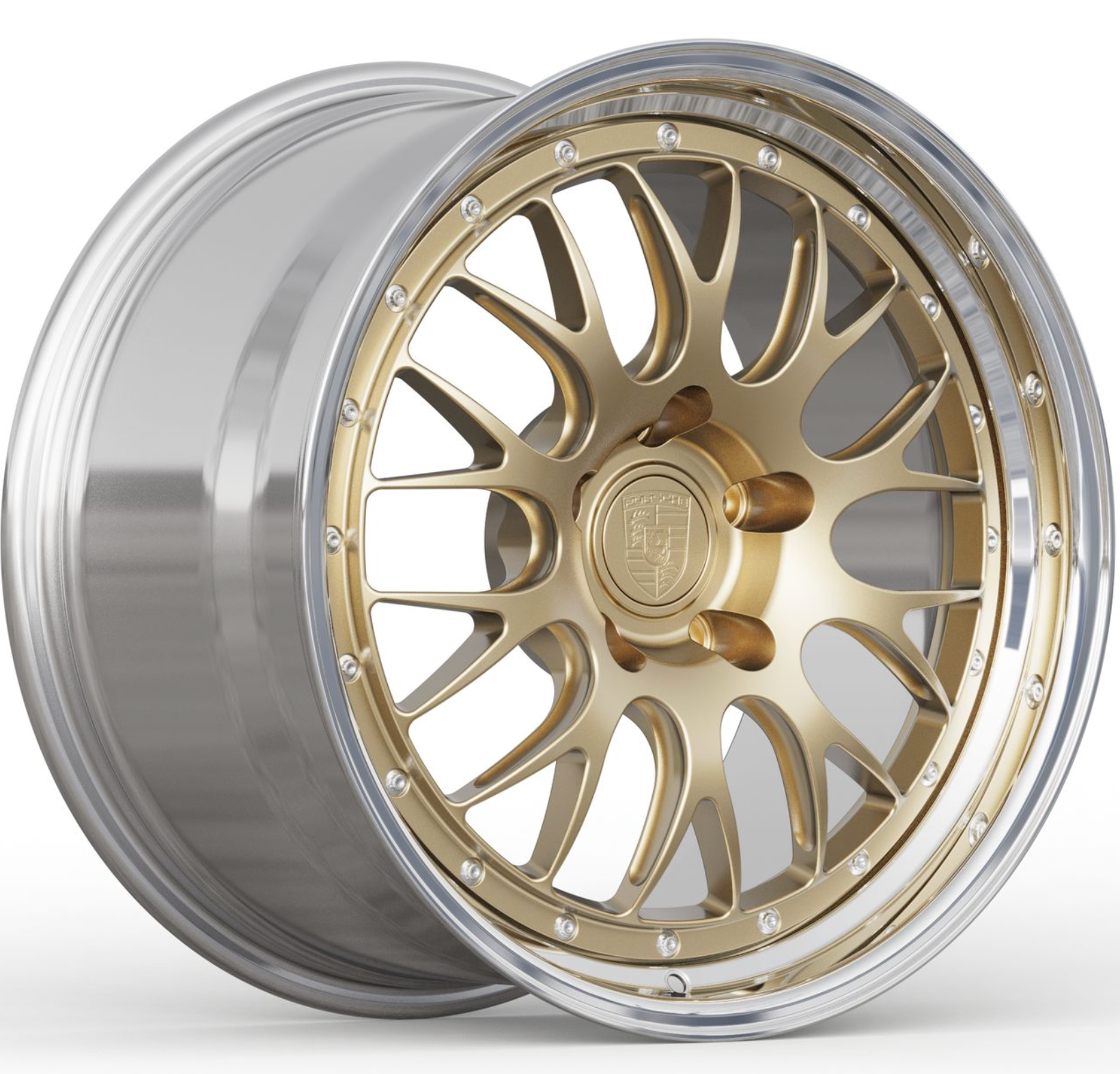 Satin white gold mag-style wheels, freshly built for a 718 GT4RS in stock sizing w/ knurled beads.