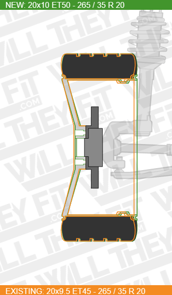 Compared to your existing wheel, this new wheel will have an inner rim which is 11.4mm closer to the suspension strut. The outer rim will poke out 1.4mm more than before.