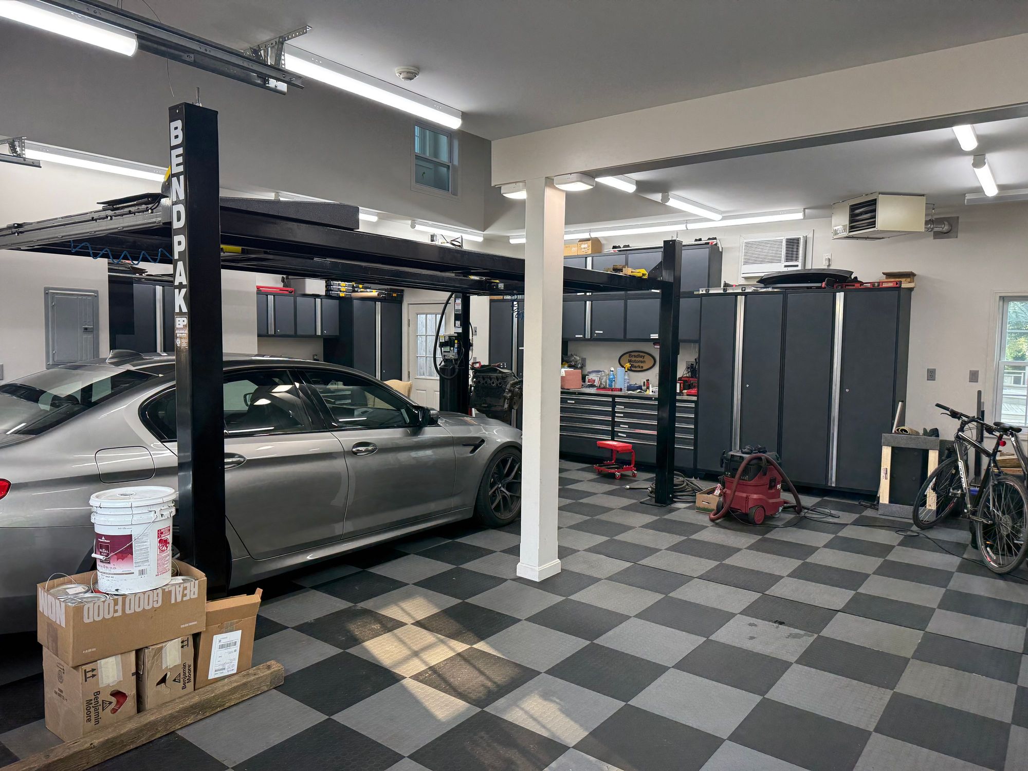 Bendpak HD-9XW, two 42 inch tool chests, three lockers full of tools, overhead cabinets, fancy tile floor (that needs cleaning)