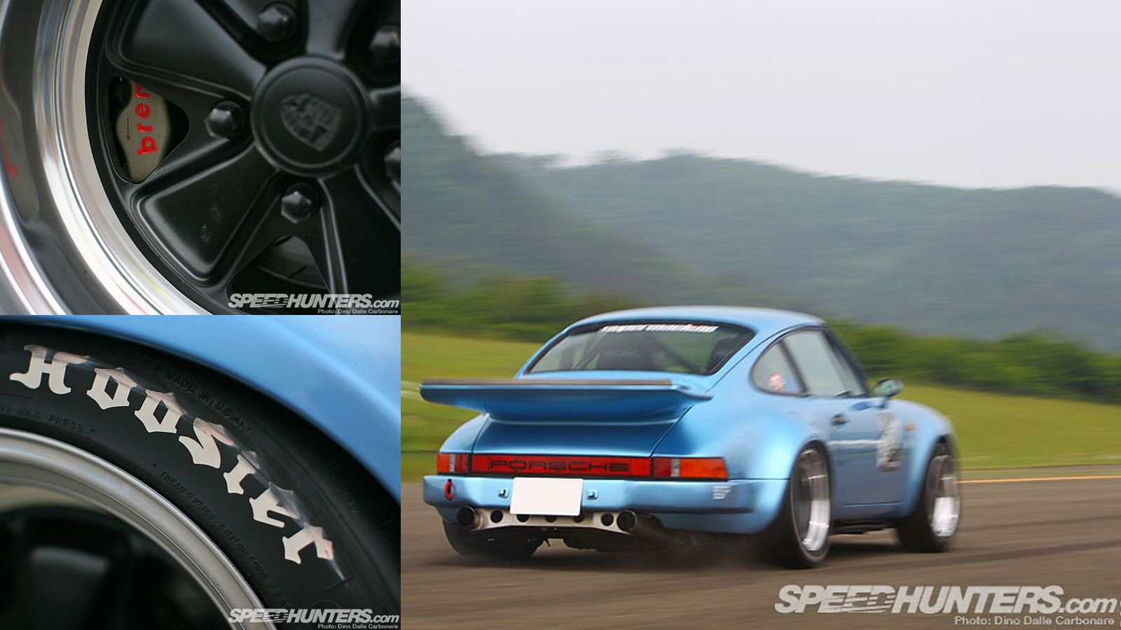 One of the beauties of the 930 platform is that you have room for plenty of tire sizes. Watanabe runs different rubber for different events—for the Motor Head Zero Yon drags the 930 wore Kumho V700 225/45 tires in the front, and Hoosier 315/35 drag radials out back, over 16x8 front and 17x11 rear, period-correct, Fuchs alloys. Watanabe installed four-piston Brembo Racing calipers at all four corners to haul all that rubber to a stop, working with PFC 323 x 29mm front and 313 x 25mm rear discs. It looks great, it's got 7 liters of V-8... what'll it do? Remember this car was built to be put on the track, and on Fuji Speedway in Japan, it turned a 1’50″59. There are more than a few Porsche 997 GT3 RSs that would have trouble getting close to this LS-swapped 930's time, proving that hot-rodding is always the answer.
