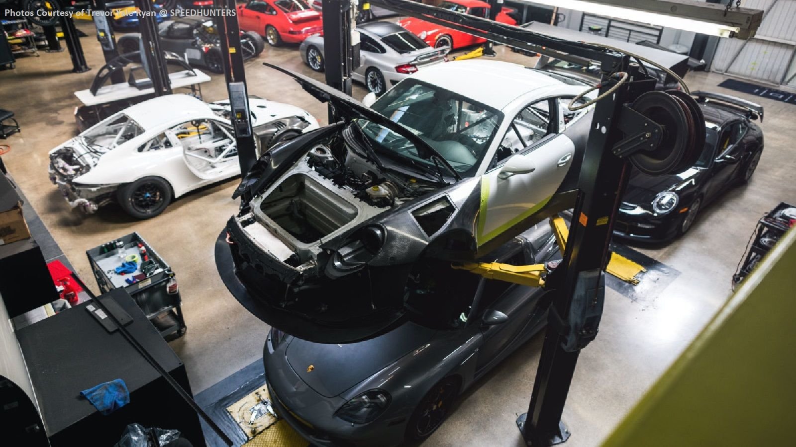 SpeedHunter's Trevor Yale Ryan was recently invited to tour BBi Autosport's Huntington Beach, CA facility. Thankfully, he shared a wealth of photos for us Porschephilles to ogle over. From this tour, we are able to see the sweet showroom, a workshop stuffed full of Porsches, and the R&D department where a number of trick bits are produced/assembled.