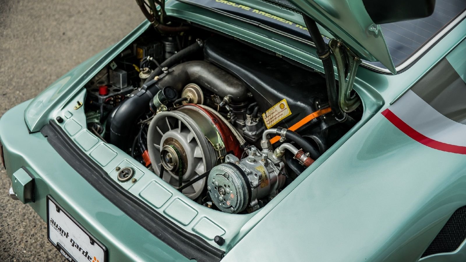 The interior features a set of Zender power bucket seats finished in green cloth to match the original factory color. Besides the recently installed Momo Prototipo steering wheel, the car retains many of its correct parts installed both by Porsche and Kremer such as the air-conditioning system, corded cellular phone, CB radio, and a premium Blaupunkt sound system with an equalizer.